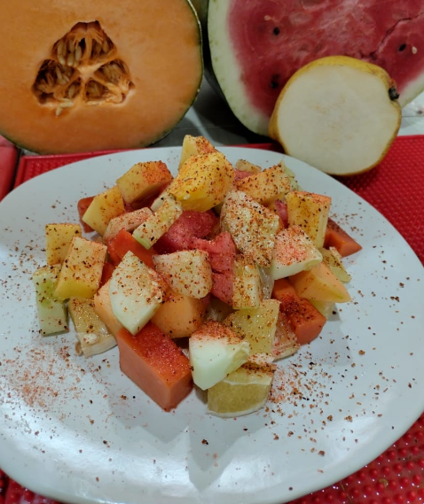 Cóctel con melón, papaya, sandía, naranja, manzana, sal, limón, Tajín o Miguelito.