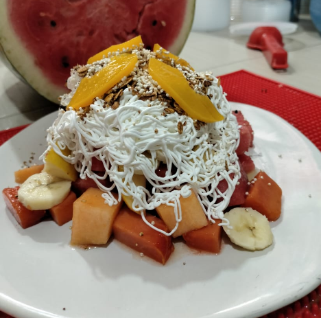 Cóctel de fruta picada que contiene melón, papaya, sandia, manzana, plátano, miel, chantilly, granola y durazno.