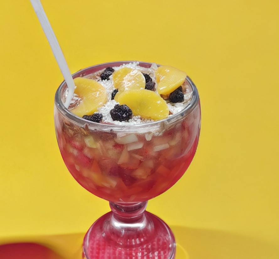 Cóctel con melón, papaya, sandía, naranja, manzana, piña, sal, limón, Tajín o Miguelito.