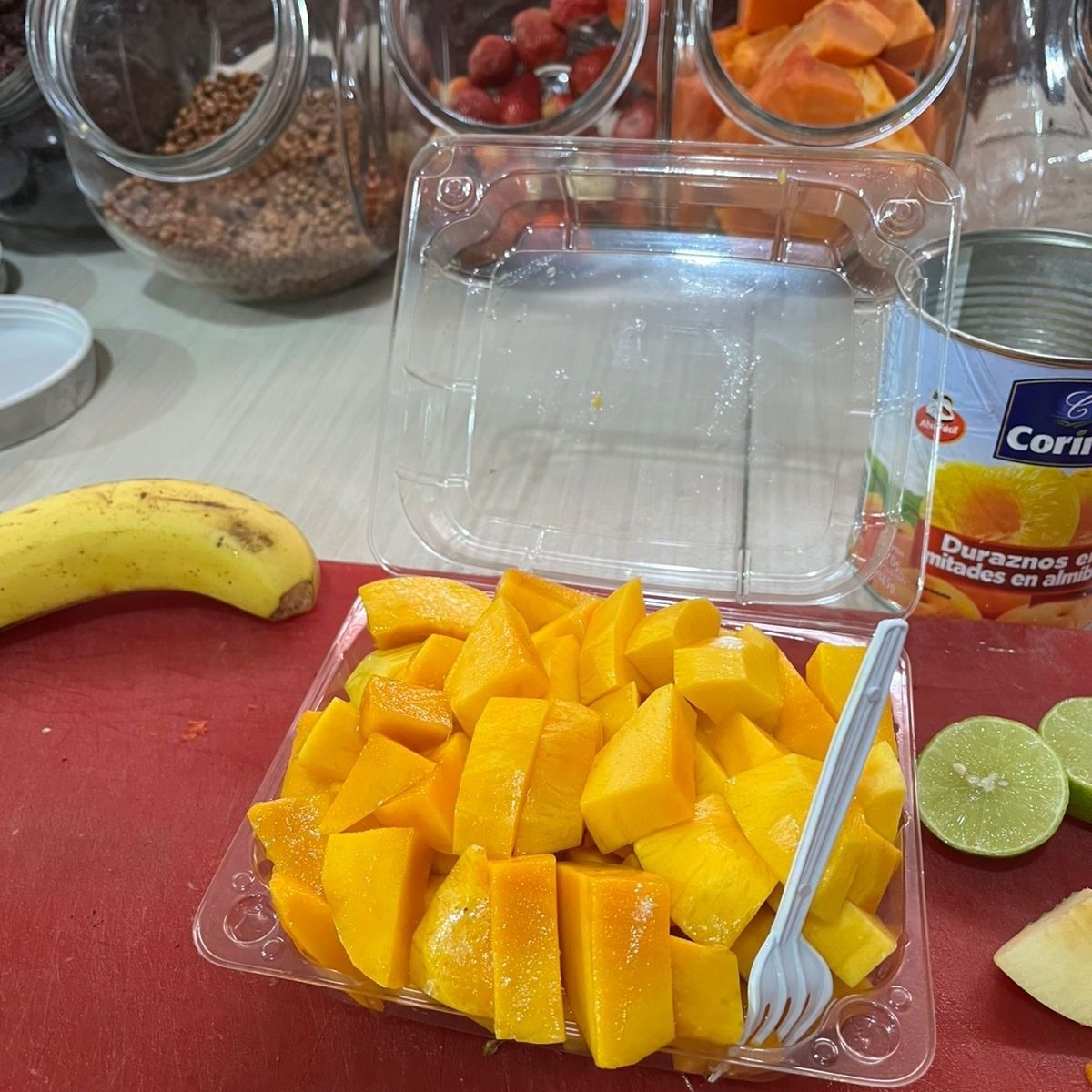 Fruta picada que contiene melon, papaya, manzana, platano, fresa, sandia, piña, jugo de naranja, miel, granola, amaranto, avena y durazno.