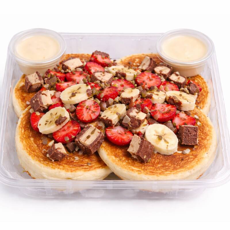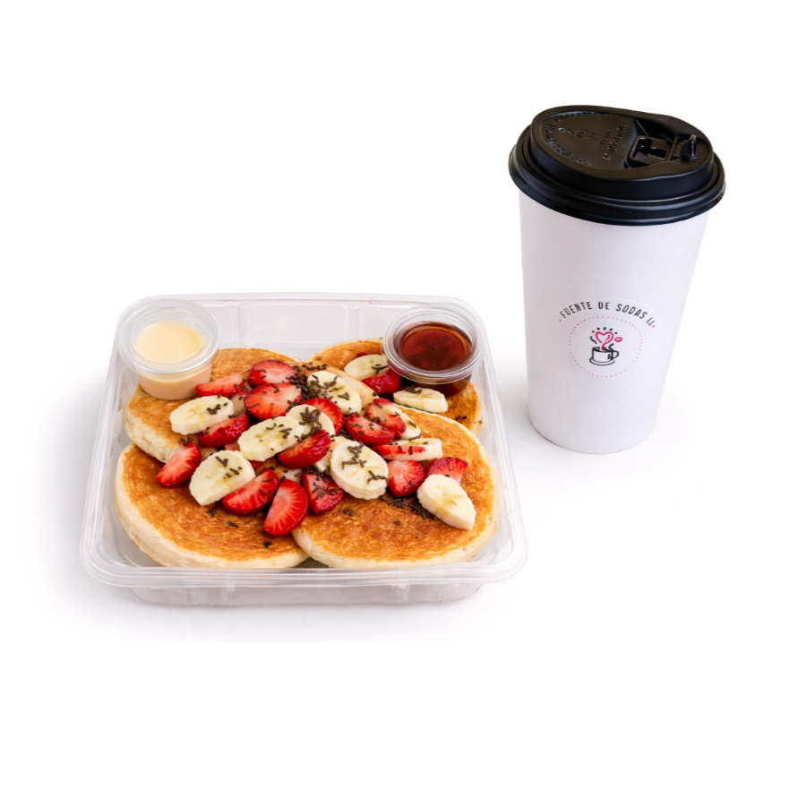 5 hot cakes medianos con fresas y plátano con 2 toppings a elegir. TOPPING 1: Maple, lechera, cajeta, mermelada. TOPPING 2: Chispas de chocolate, galletas oreo, lunetas, granola. INCLUYE chocolate con leche de 355 ml. *ligeramente endulzado con opción a elegir leche entera o deslactosada. ✅Recuerda que todos los productos son cuidadosamente seleccionados para servirte lo mejor ;)