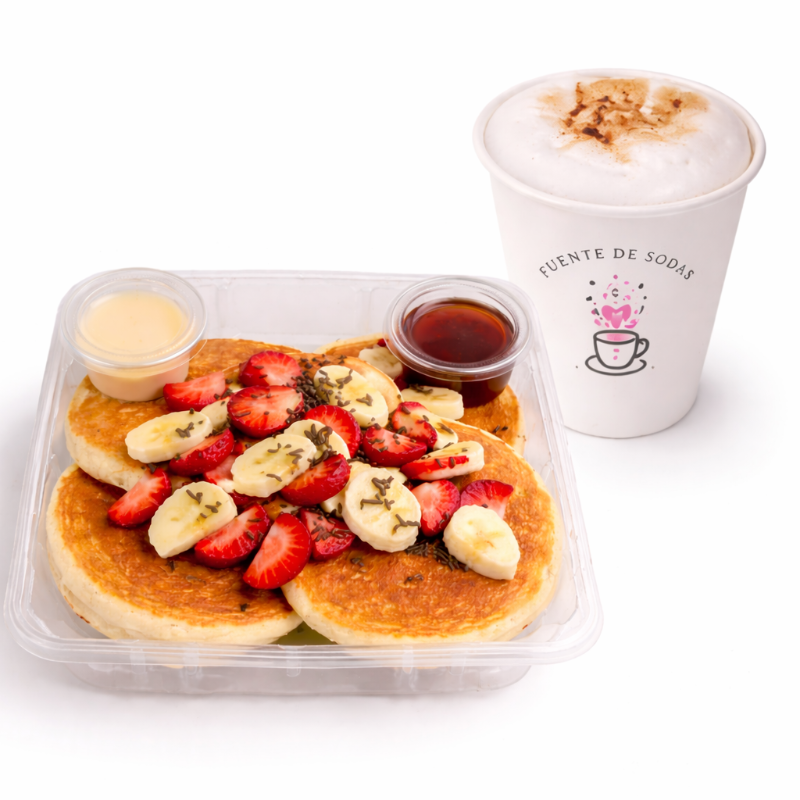 5 hot cakes medianos con fresas y plátano con 2 toppings a elegir. TOPPING 1: Maple, lechera, cajeta o mermelada. INCLUYE un café latte o capuchino de 355 ml. ✅Recuerda que todos los productos son cuidadosamente seleccionados para servirte lo mejor ;)