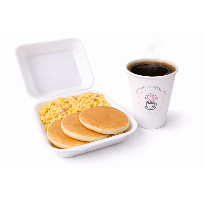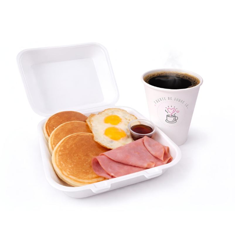 2 huevos estrellados, 3 hot cakes medianos con maple, 2 rebanadas de jamón frito o tocino frito. INCLUYE: Una bebida a elegir de 355 ml. ✅Recuerda que todos nuestros ingredientes son cuidadosamente seleccionados para servirte lo mejor ;)