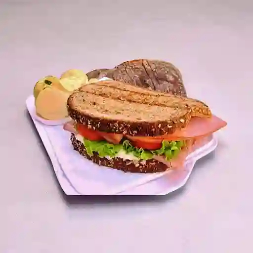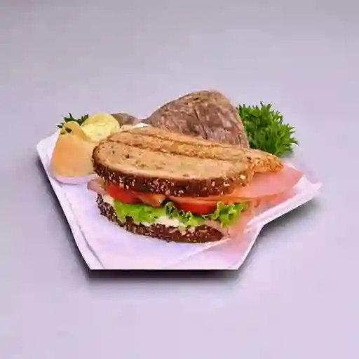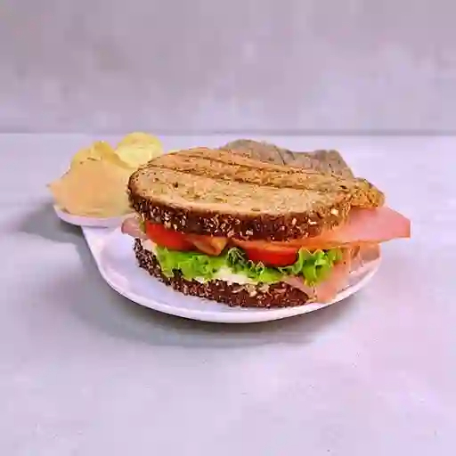 Sándwich con jamón de pavo, lechuga, jitomate, aguacate, queso amarillo y mayonesa.