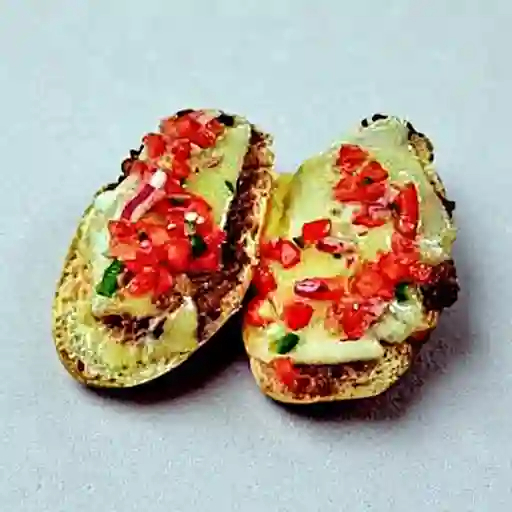 Molletes con frijoles, pico de gallo de jitomate, cebolla, chile verde picado, proteína y tamaño a elegir.