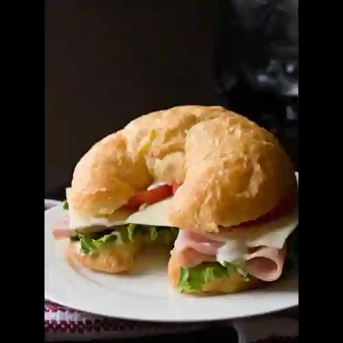 Cuernito con jamón, lechuga, jitomate, aguacate, queso amarillo y mayonesa.