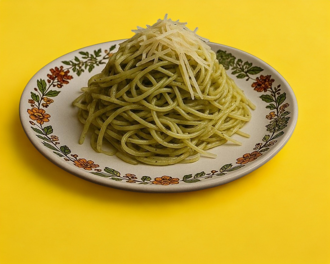 pasta al dente acompañada de una salsa verde y aromática hecha con albahaca fresca, piñones, ajo, aceite de oliva y queso parmesano. Su sabor fresco y la convierte en una opción deliciosa y reconfortante.