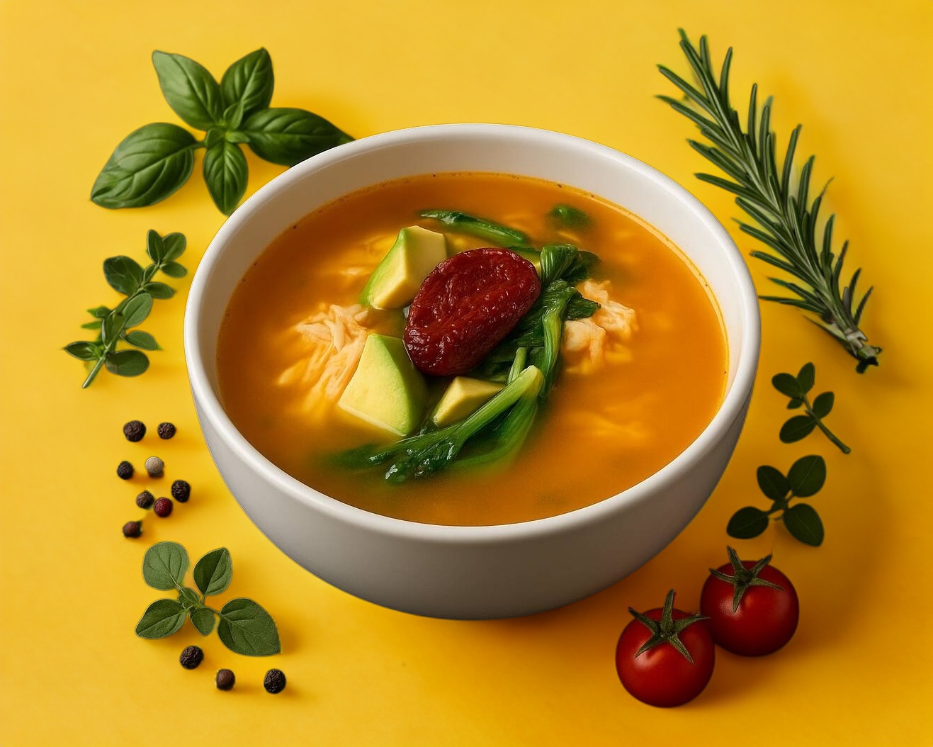 )Reconfortante caldo de pollo con una seleccion de verduras frescas, calabaza, jitomate, zanahoria, chayote, ejotes, col, espinaca y apio. (350ml) 5pz de tortilla de maiz o 1pz de bolillo(entero o rebanado y tostado)