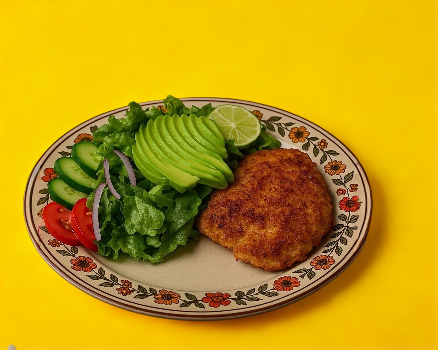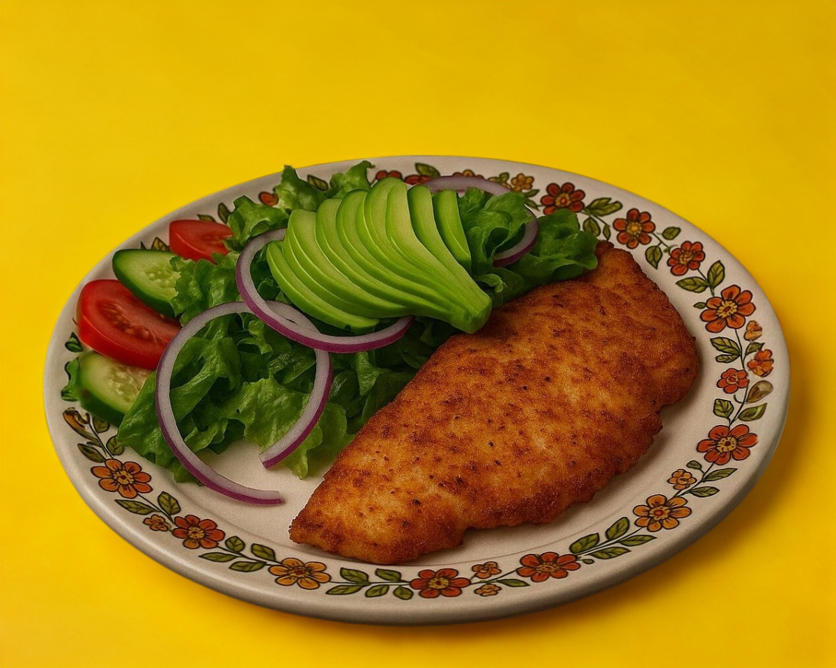 Milanesa de res crujiente, empanizada a la perfeccion,acompañado de una fresca ensalada de lechuga, jitomate, cebolla, pepino y aguacate.