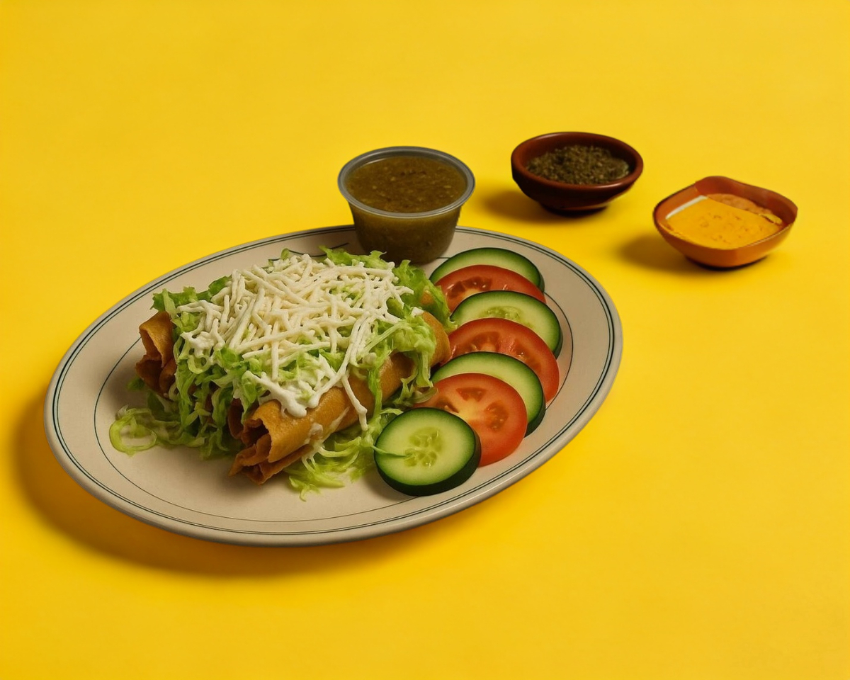 Tortilla dorada rellena de pollo. acompañada de crema, lechuga y queso. servida con una fresca ensalada de jiyomate y pepino. acompañada con una salsa de su eleccion(verde o roja). 4pz de tacos dorados, 20ml de salsa (verdeb o roja)