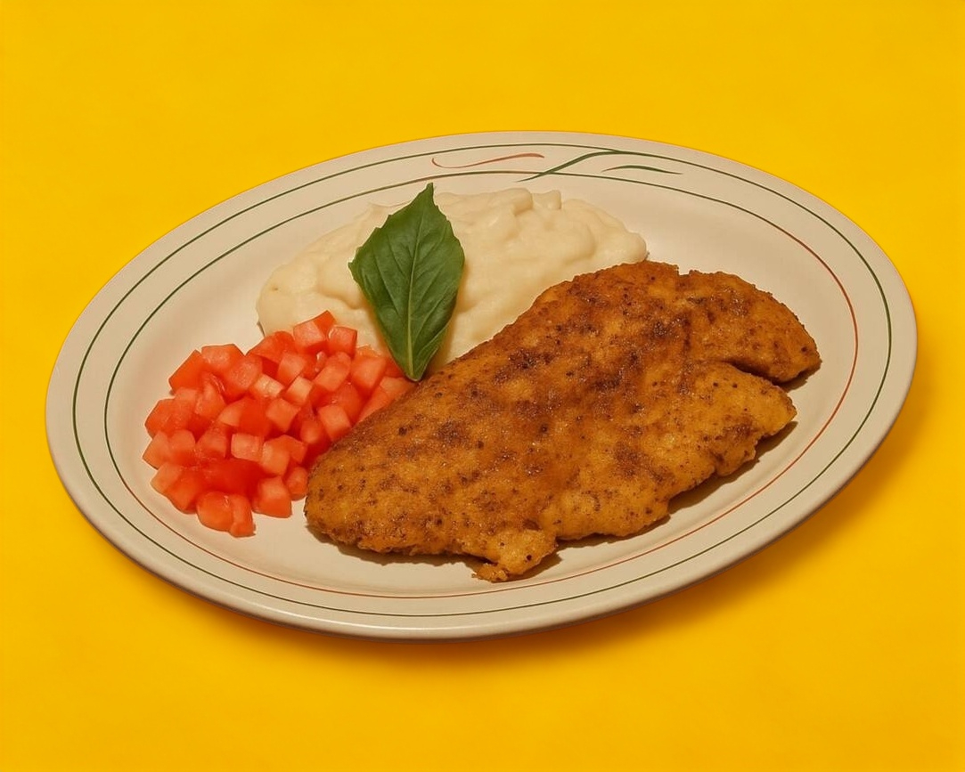 Milanesa crujiente bañada en salsa pomodoro, gratinada con queso pizzero y parmesano fundido, servida con un cremoso puré de papa que conquista desde el primer bocado