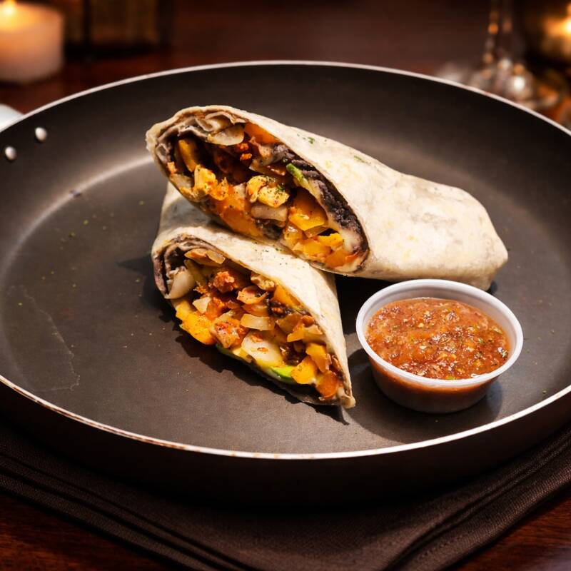 Corazón de jugosos trozos de pollo a la plancha, salteados con tocino crujiente, longaniza de la casa, jamón y cebolla acitronada. Todo fundido bajo una generosa capa de queso manchego gratinado. Servido en tortilla de harina gigante, con frijoles refritos