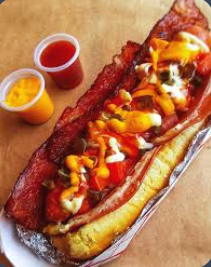 Disfruta un hot dog jumbo con salchicha grande, envuelto en tocino crujiente y coronado con trozos de piña caramelizada que le dan un toque dulce y único. Todo en un pan suave y doradito. El contraste perfecto entre lo salado y lo dulce.