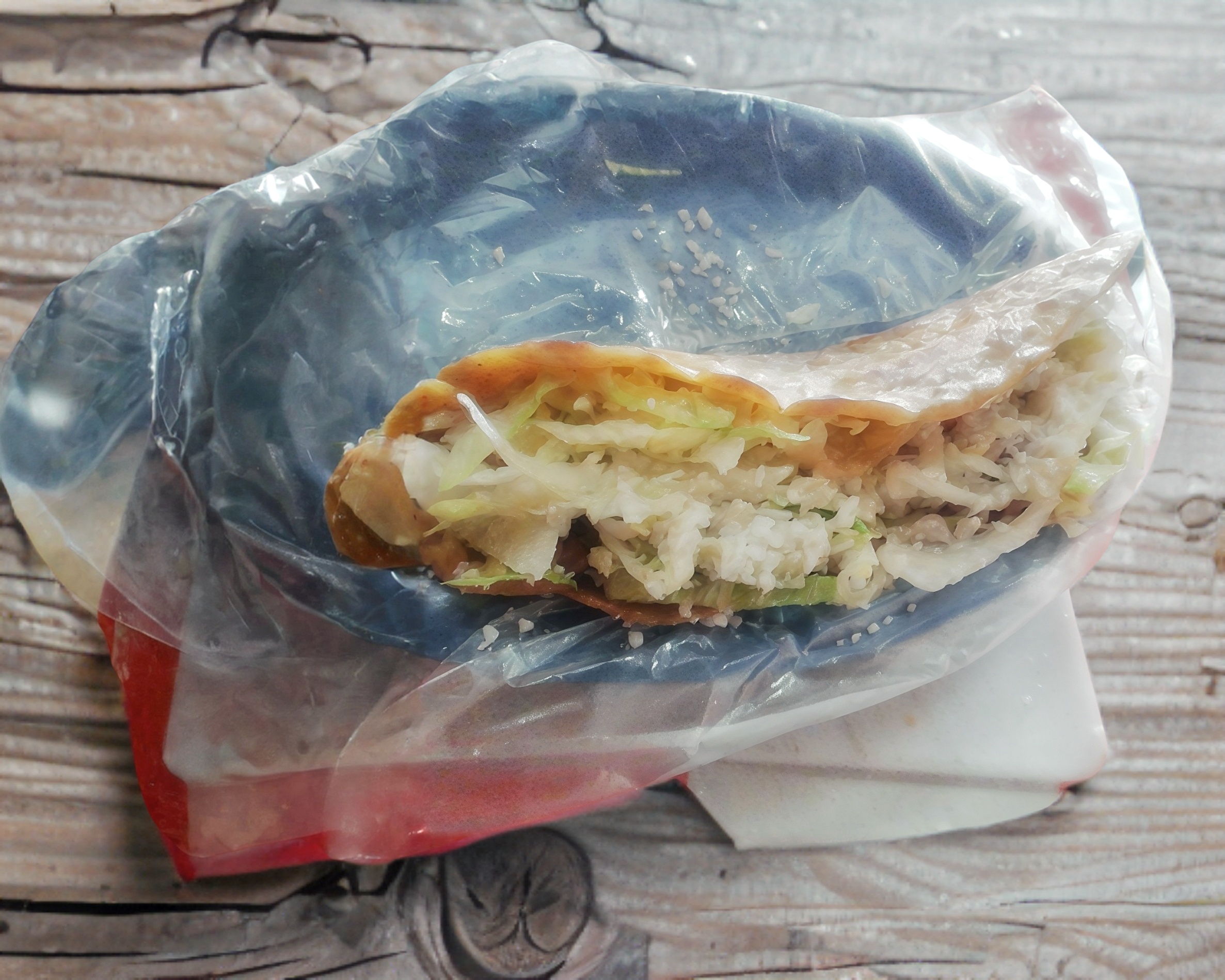 Tortilla doblada rellena con chicharrón prensado guisado, lechuga y queso rallado