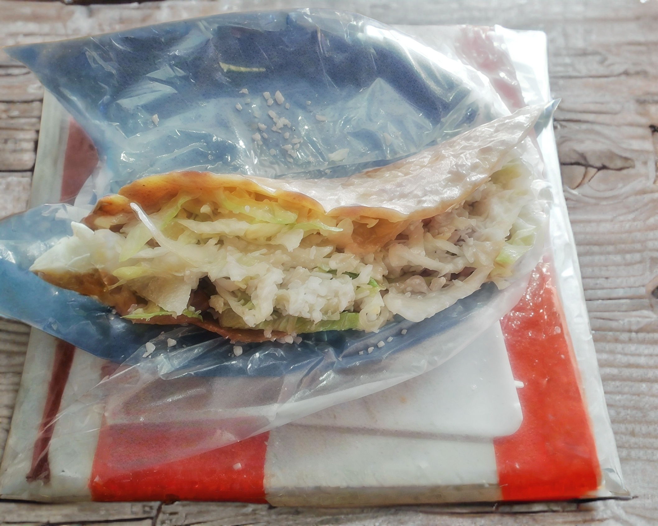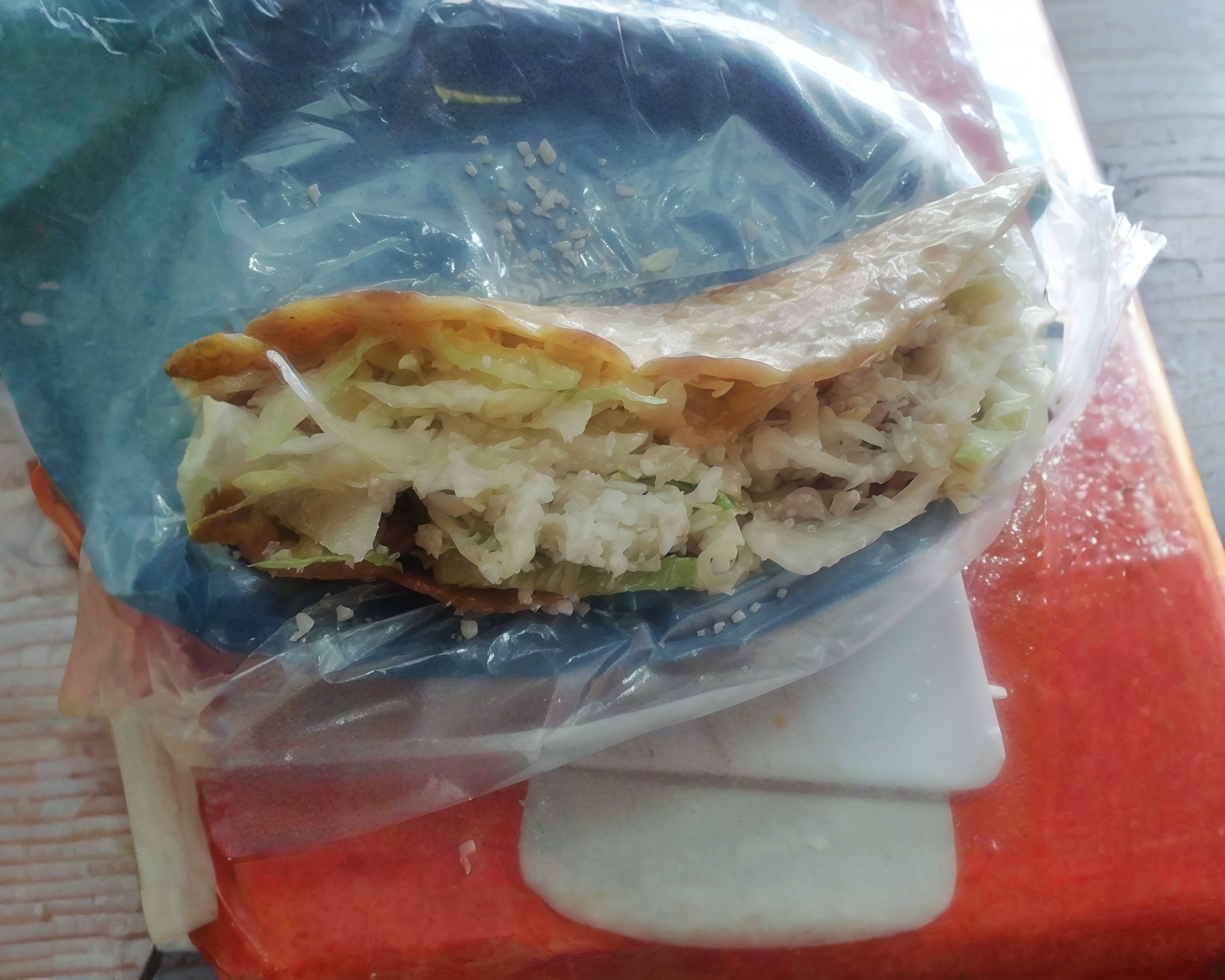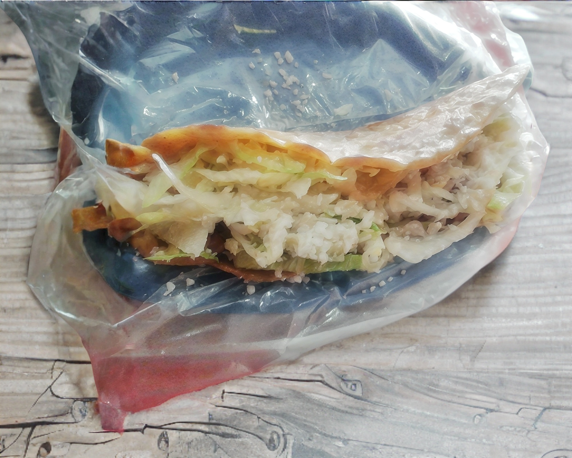 Tortilla doblada rellena con queso Oaxaca, lechuga y queso rallado