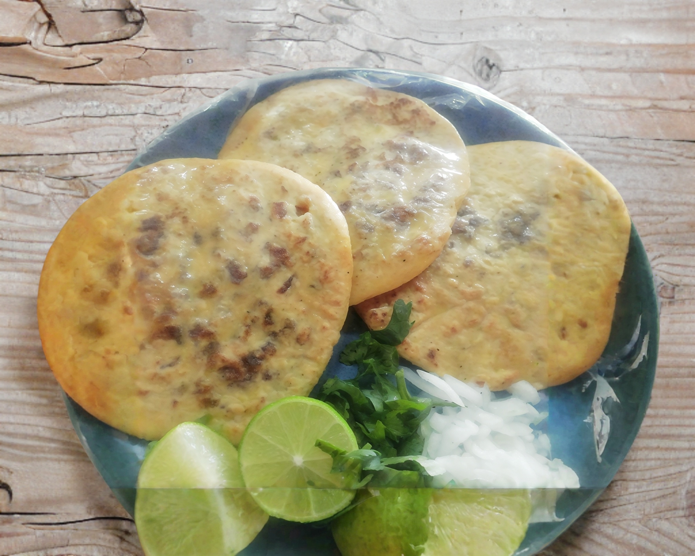 Gorditas rellenas de chicharrón, acompañadas de cebolla y cilantro, con una salsa especial