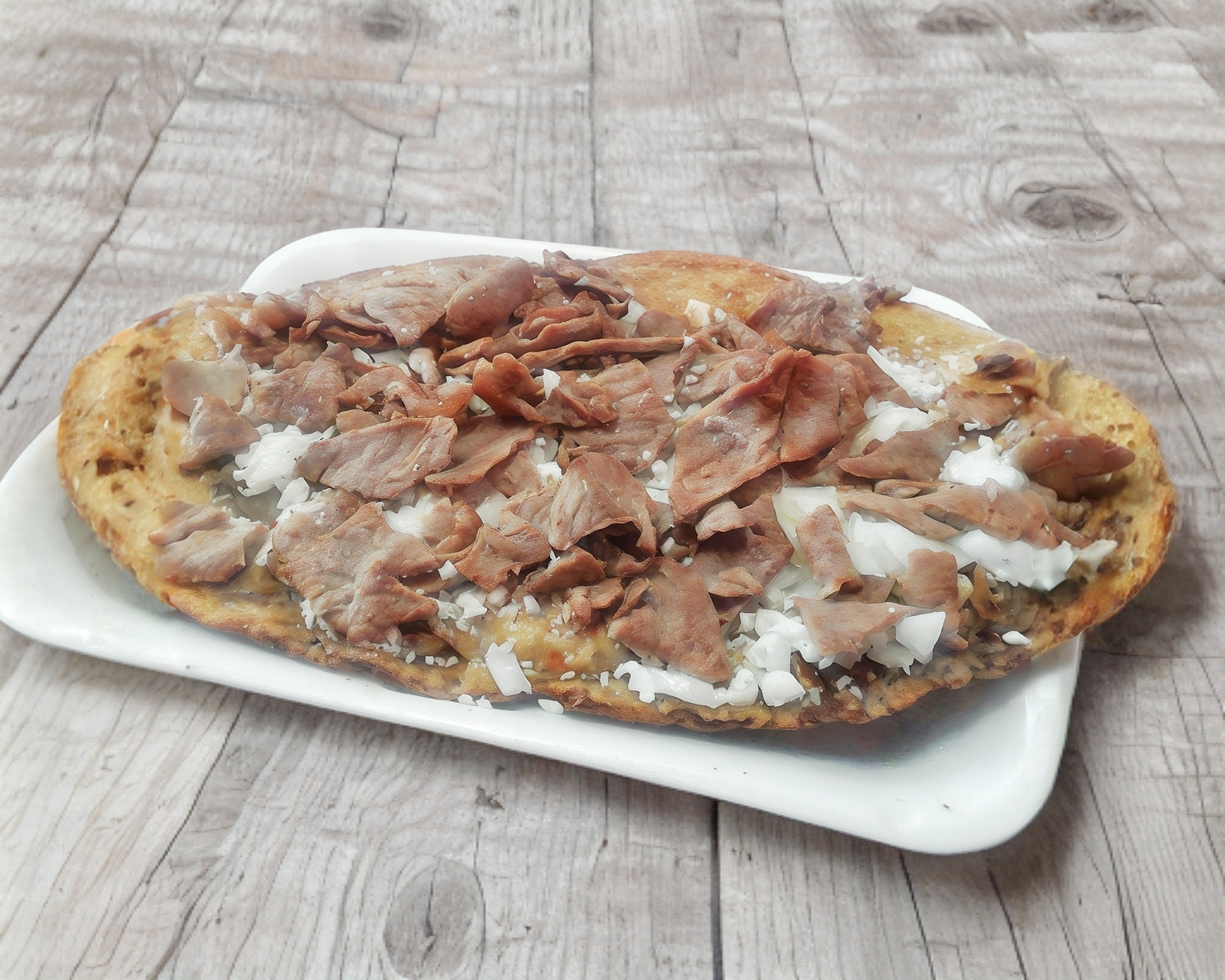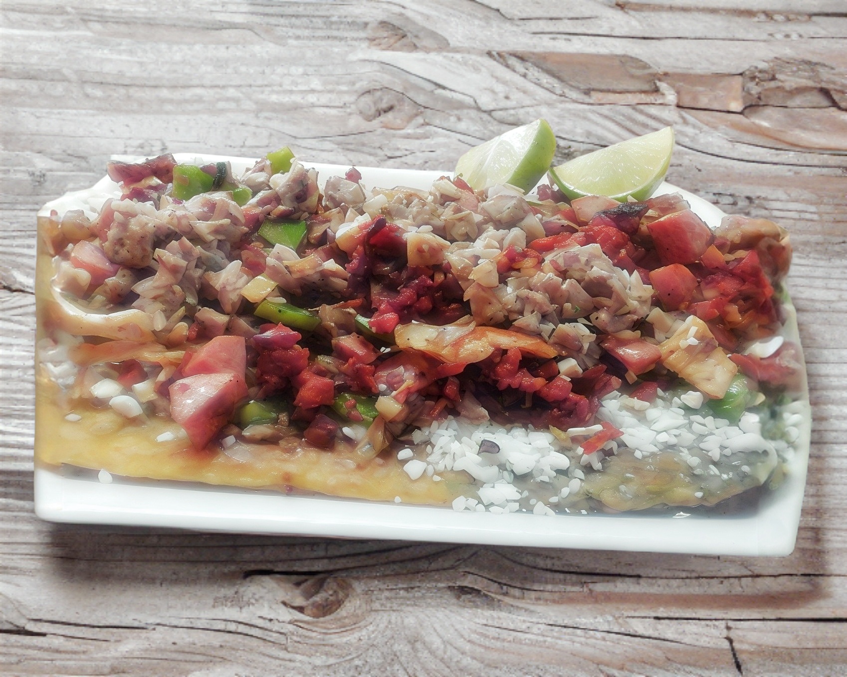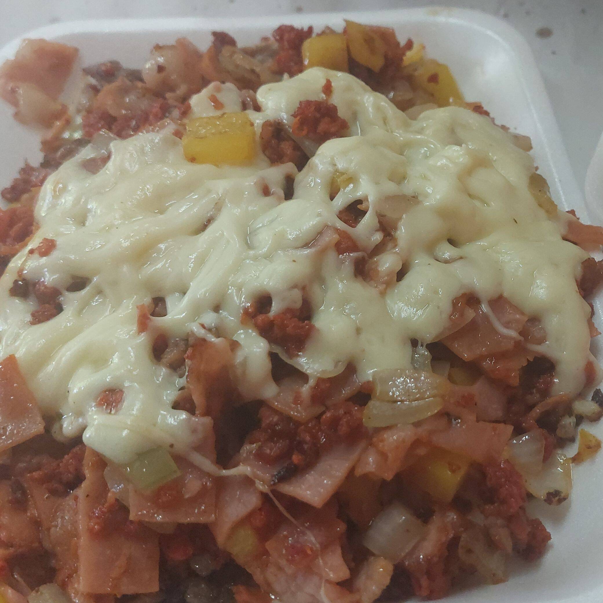 Chuleta, longaniza,carnes frías,cebolla, morrón,queso Oaxaca gratinado