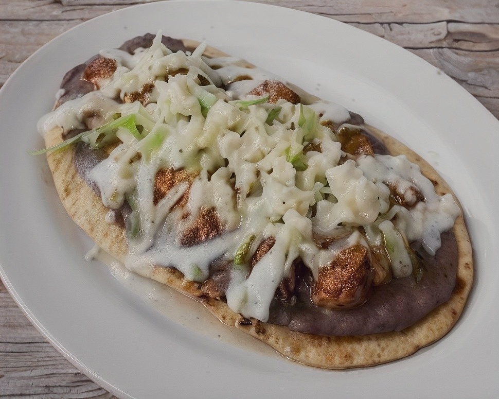 Masa rellena de frijoles, acompañado con queso rayado, cebolla, lechuga y salsa aparte,