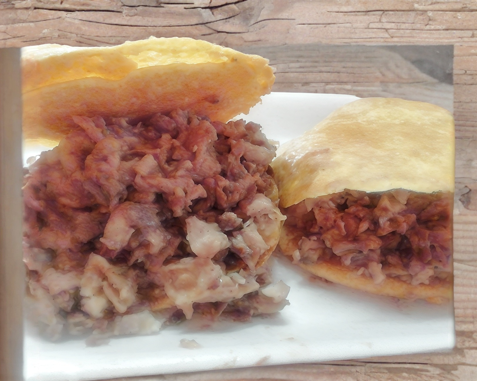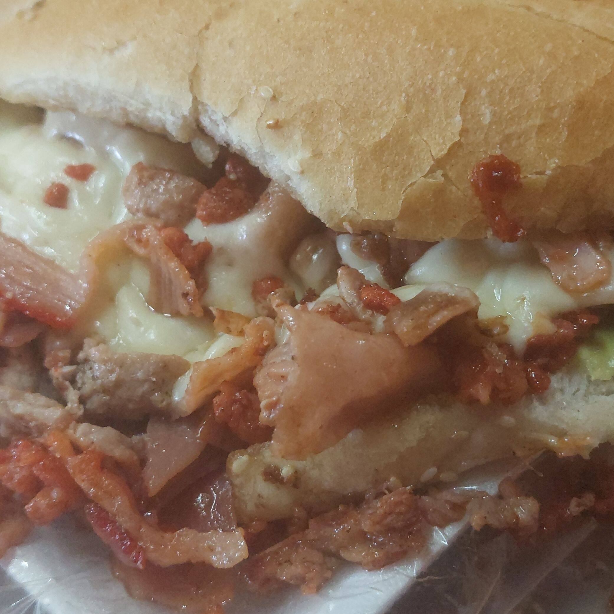 Rellena de chuleta, bisteck,carnes frias,longaniza, y quesillo derretido,,acompañado de aguacate y jitomate