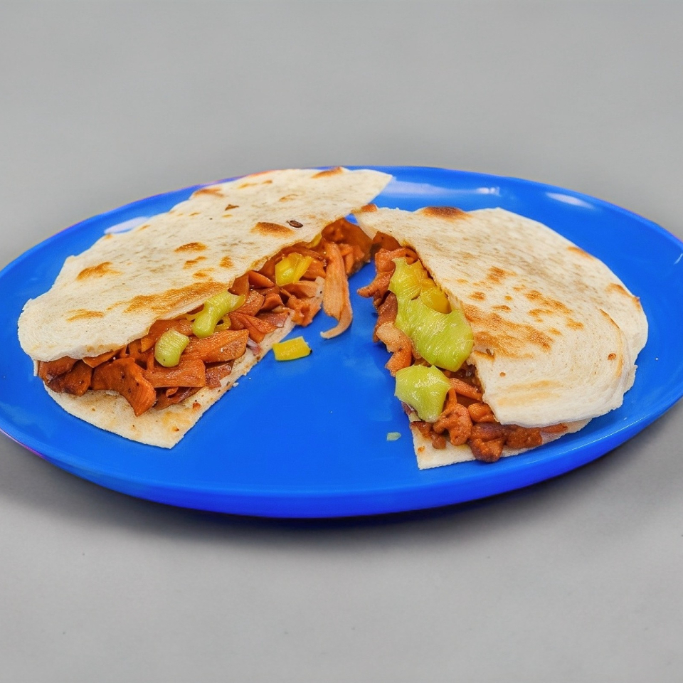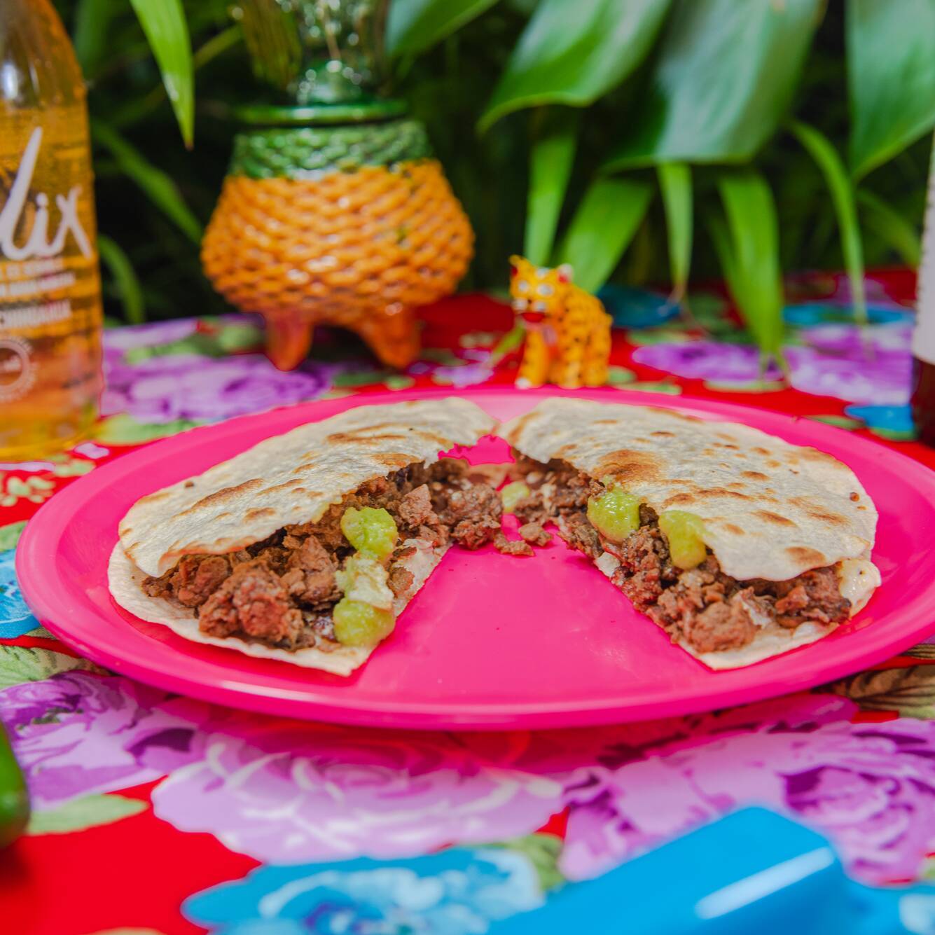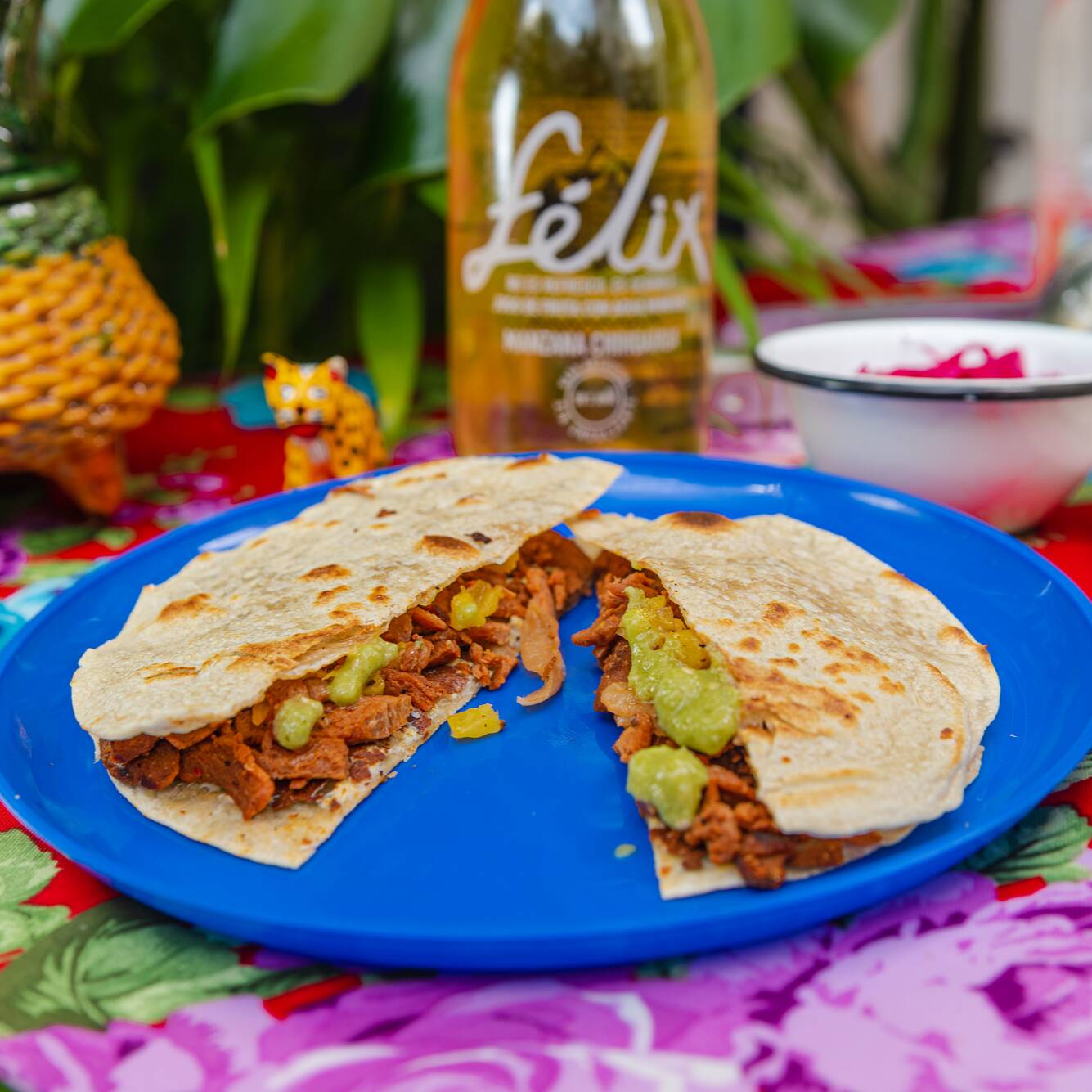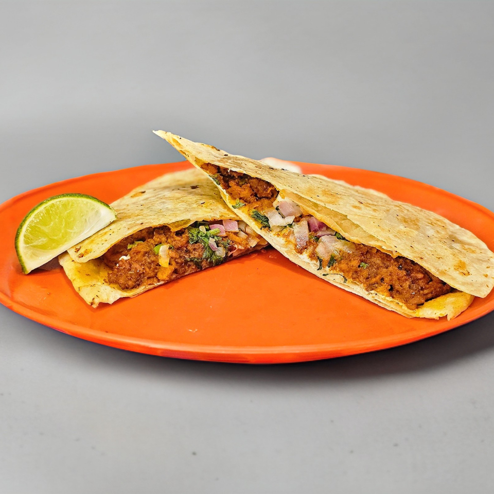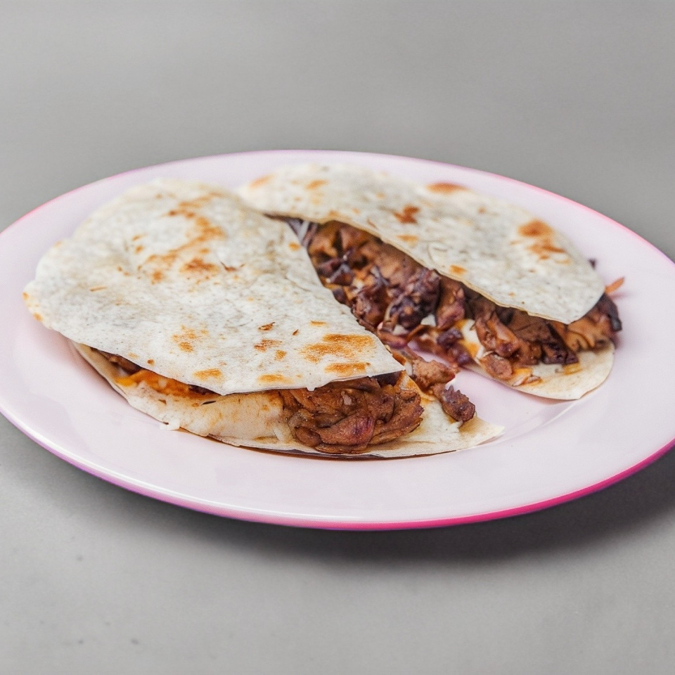 Dos tortillas de harina, queso derretido y pastor de soya.