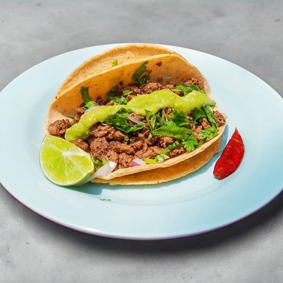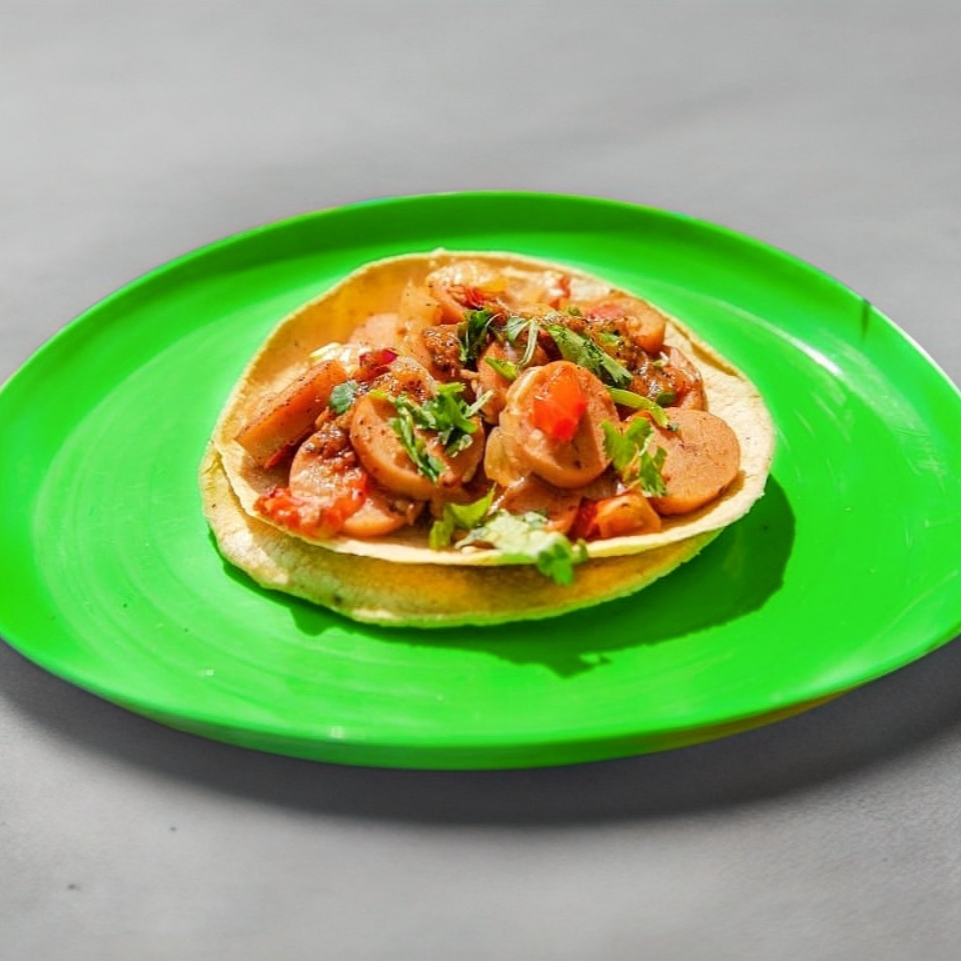 Salchicha de seitán y tofu, a la mexicana y servido en doble tortilla.