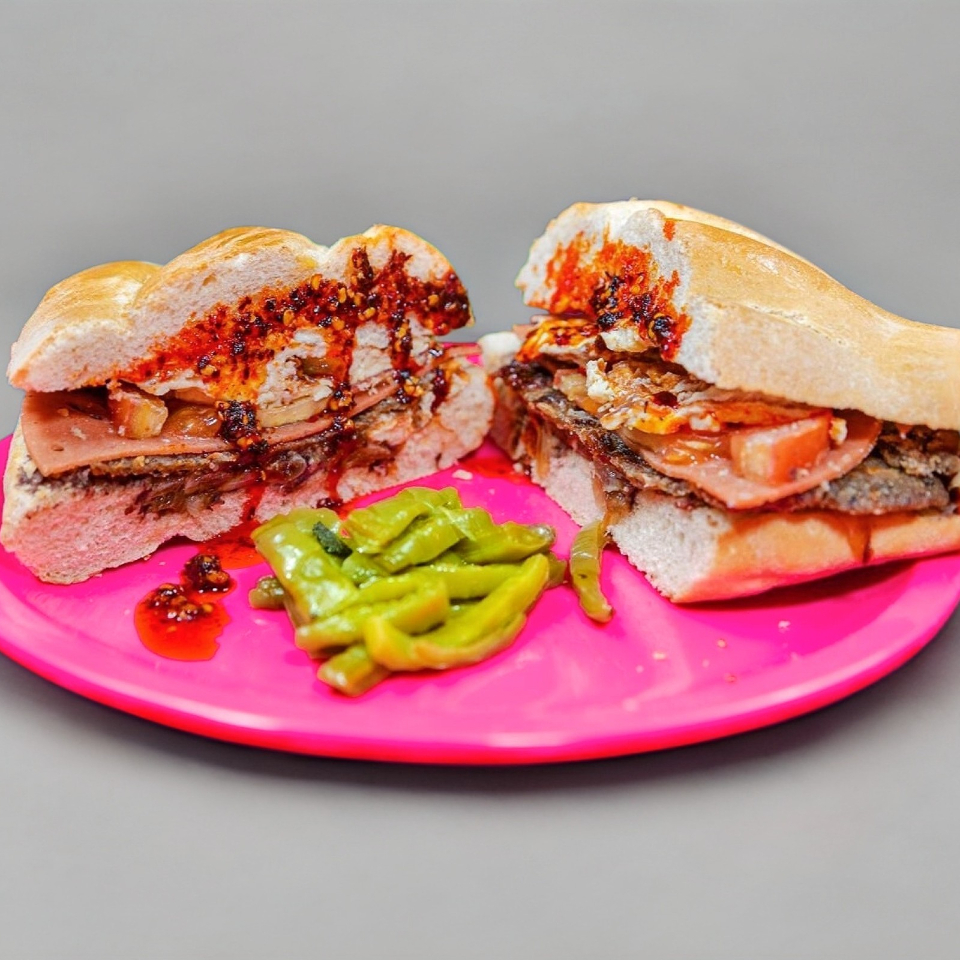 Telera grande con milanesa y jamòn gratinados, jitomate, chimichurri, mayonesa, frijoles refritos, jitomate, aguacate y cebolla caramelizada. Incluiye chipotle o chiles en vinagre.
