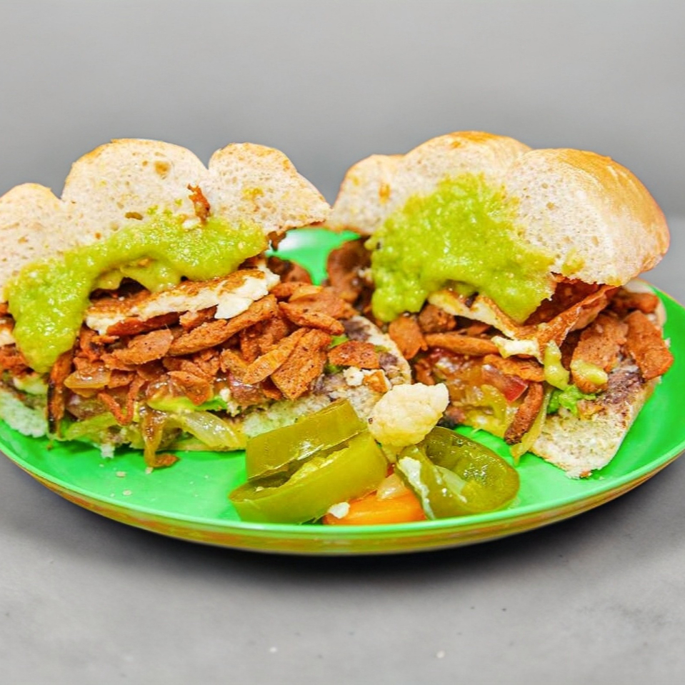 Telera grande con pastor, arrachera marinada, queso, mayonesa, frijoles refritos, jitomate, aguacate y cebolla caramelizada. Incluiye chipotle o chiles en vinagre.