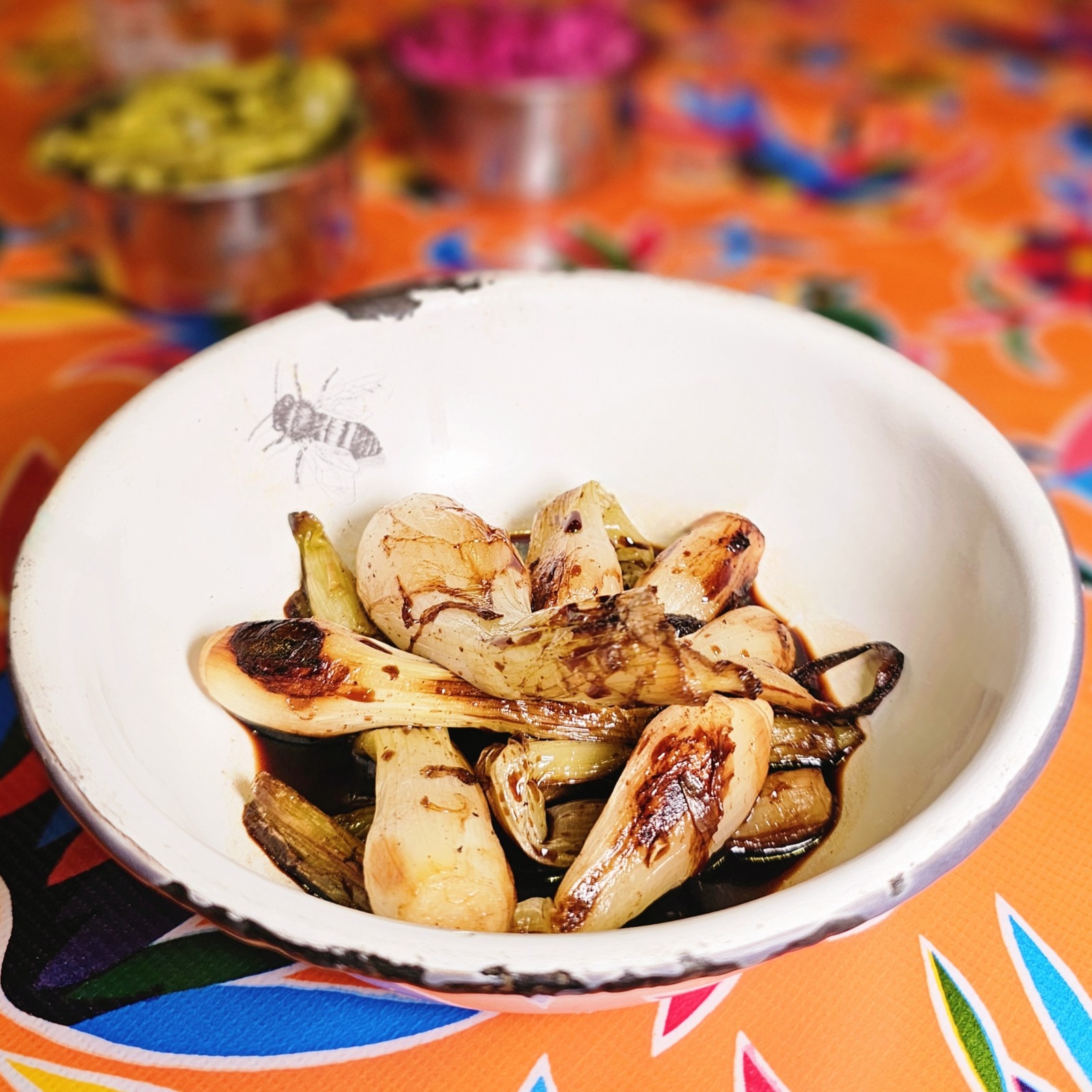 Cebollitas cambray a la plancha con salsa negras y limòn.