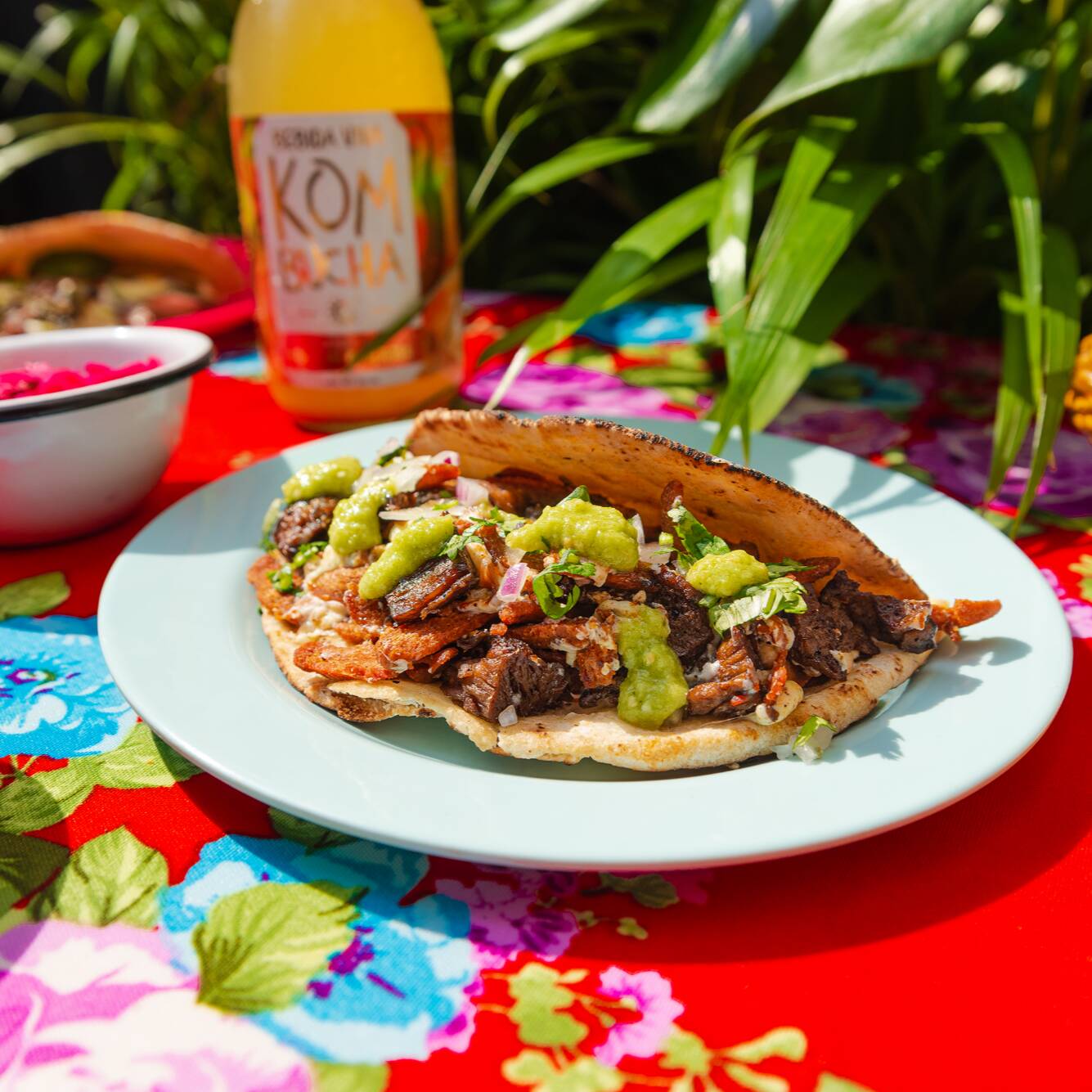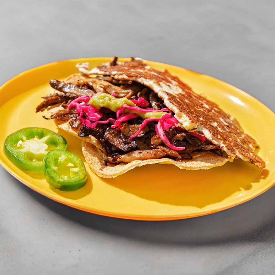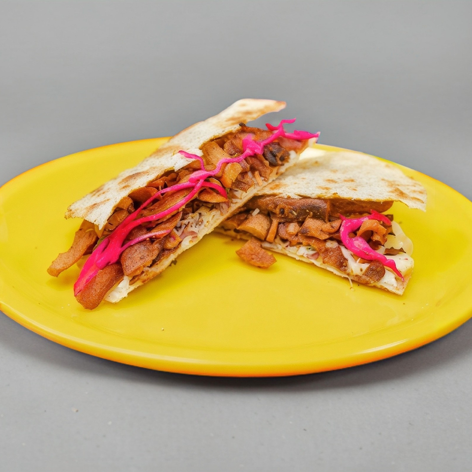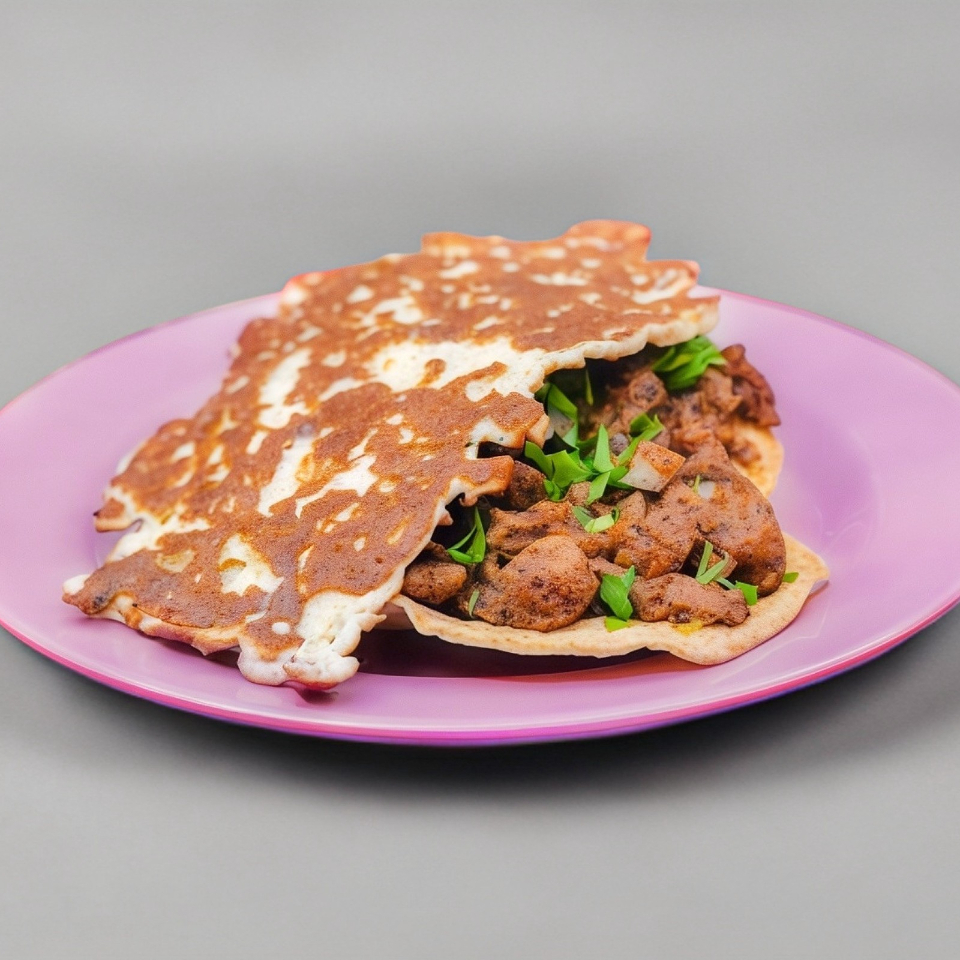 Pan árabe, arrachera marinada, pastor y queso tipo mozzarella.