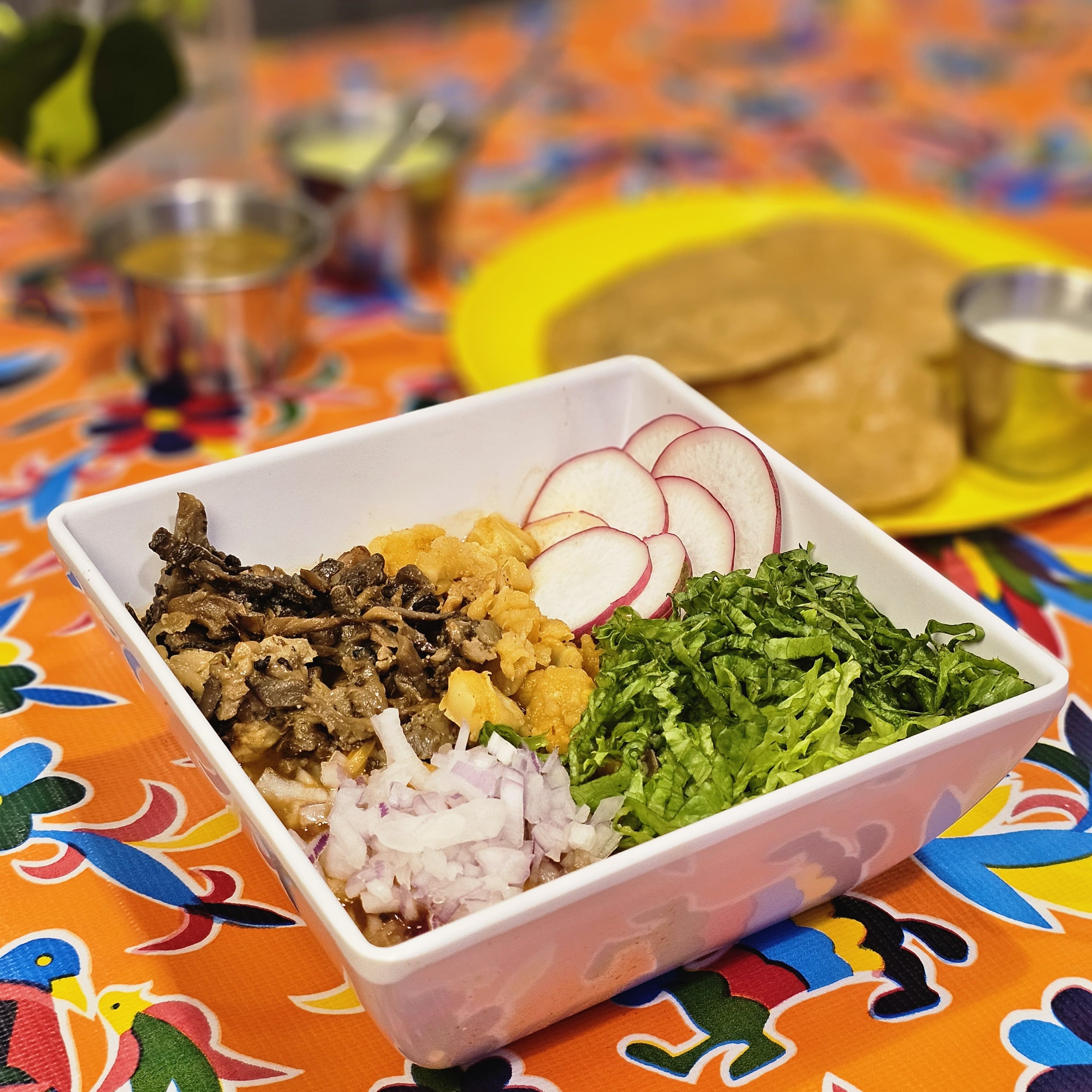 Pozole con maciza (soya y setas), acompañado de lechuga, rábano sandía, cebolla morada, limones, tostadas y crema. porción grande.