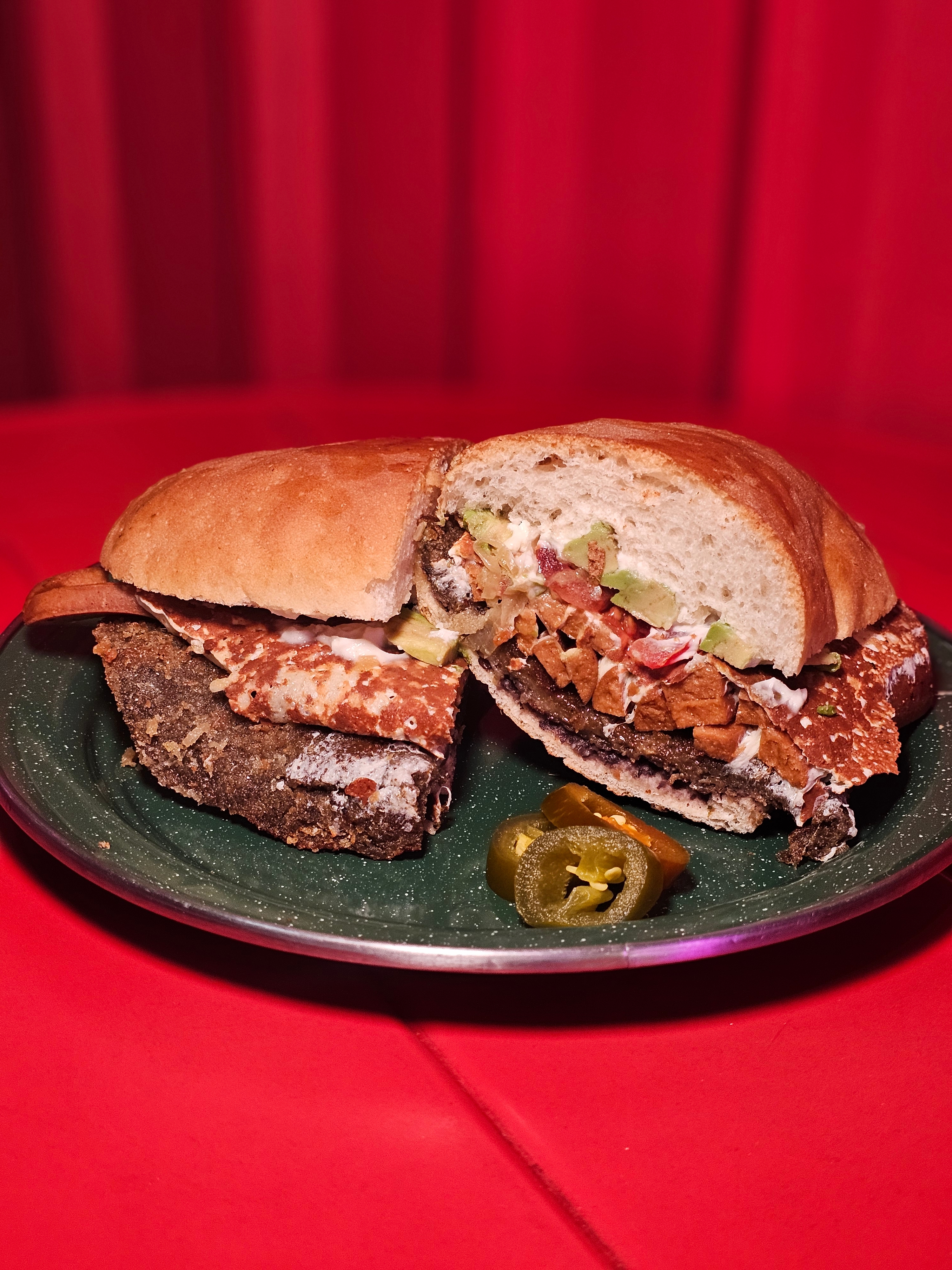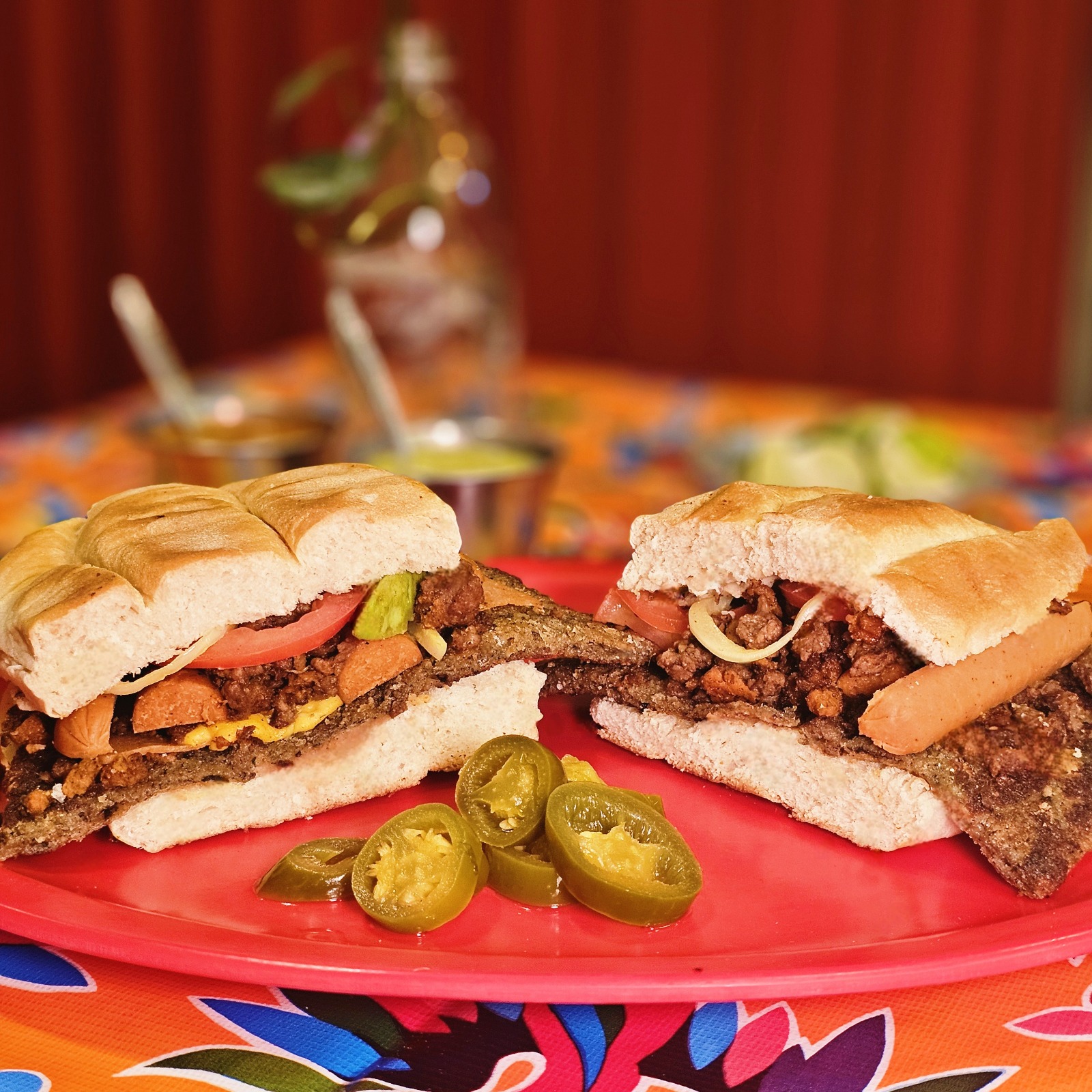 Telera grande con milanesa, jamòn, salchicha, chorizo rojo, queso, mayonesa, frijoles refritos, jitomate, aguacate y cebolla caramelizada. Incluiye chipotle o chiles en vinagre.