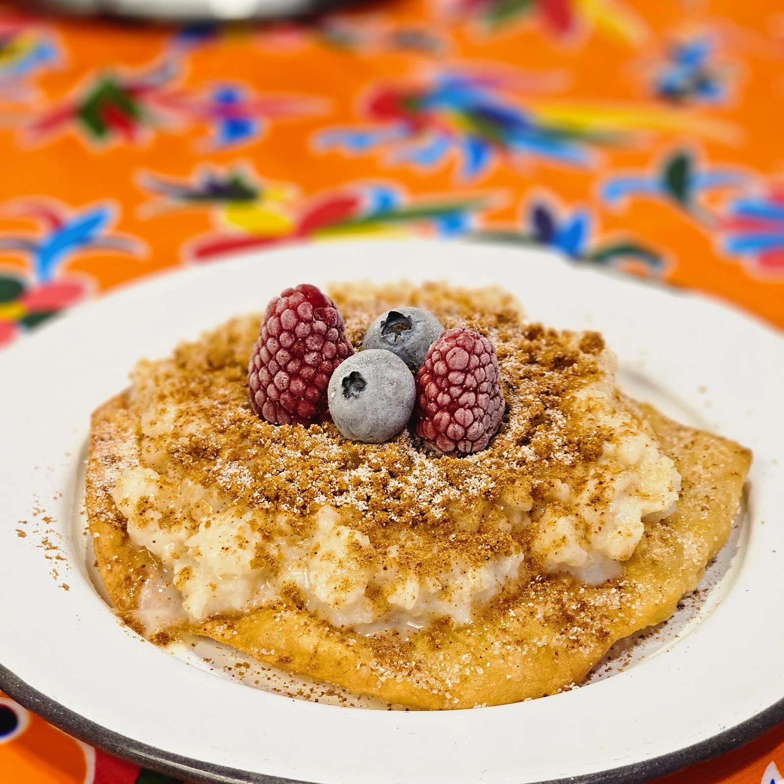 Buñuelo con arroz con leche, decorado con frutos rojos y galleta Lotus