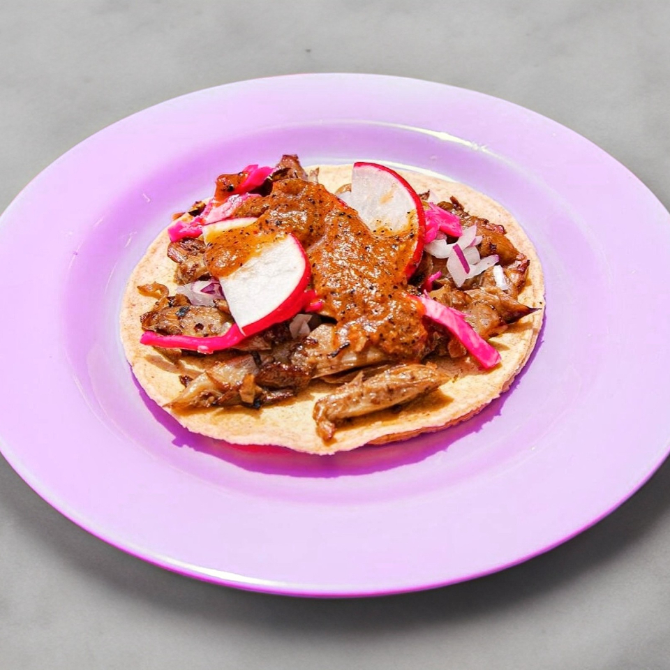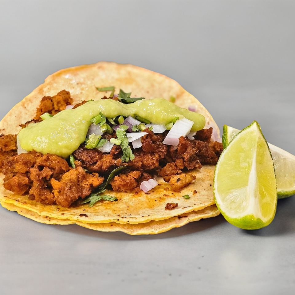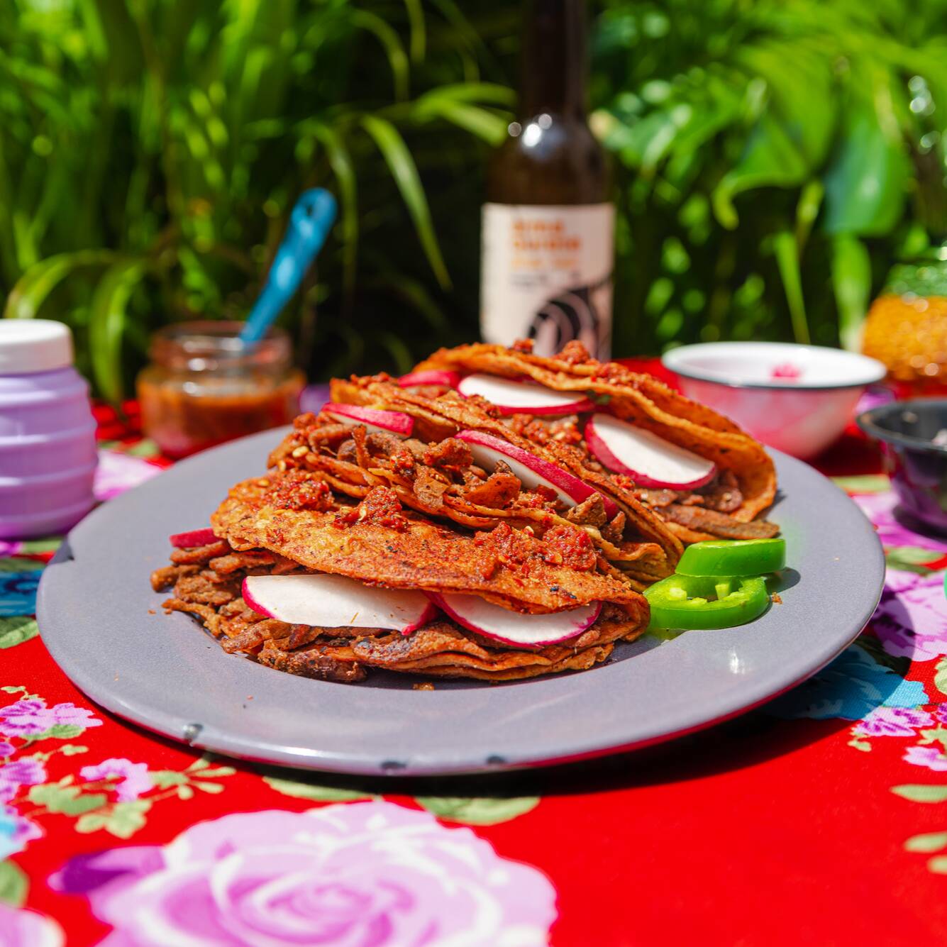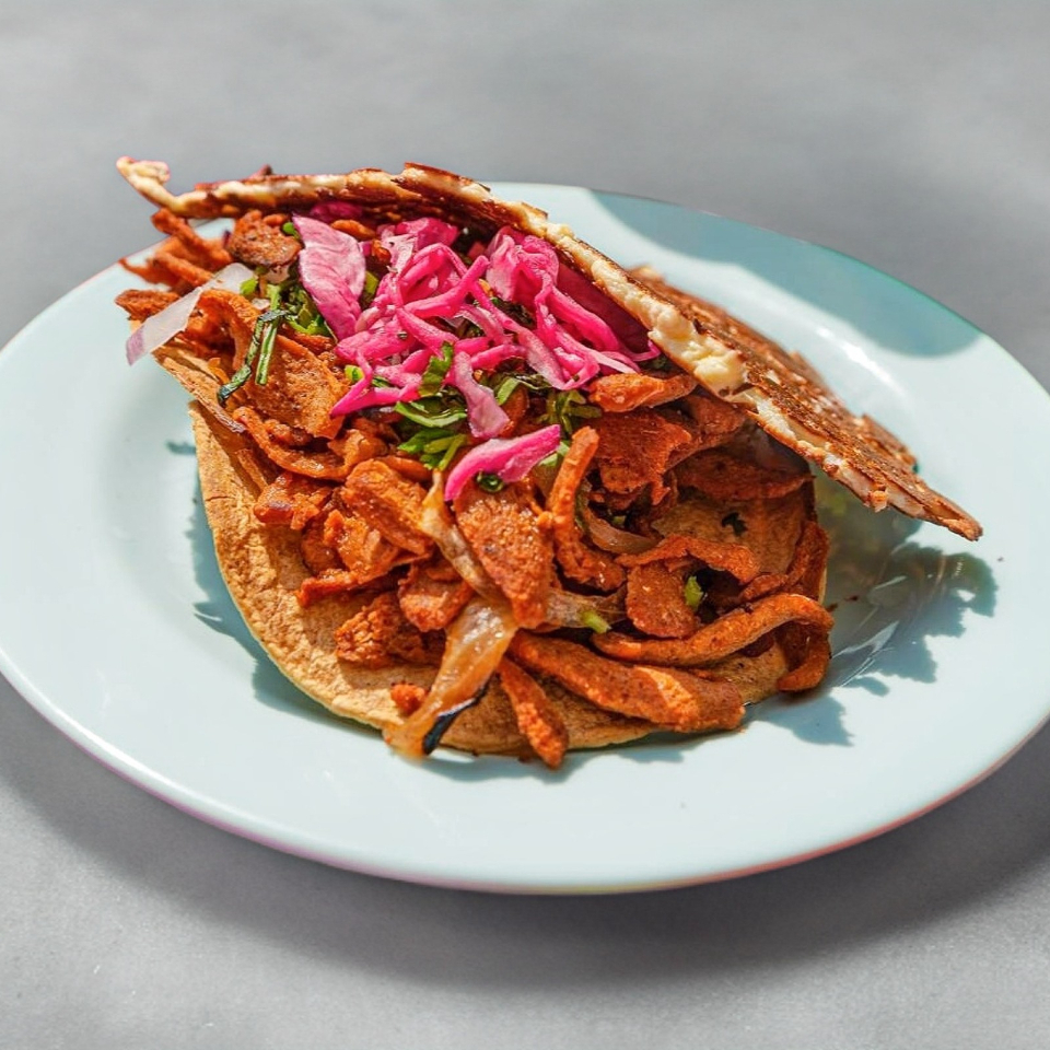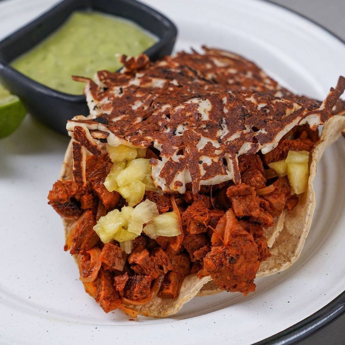 Dos tortillas de maíz tostadas, costra de queso y pastor de soya.