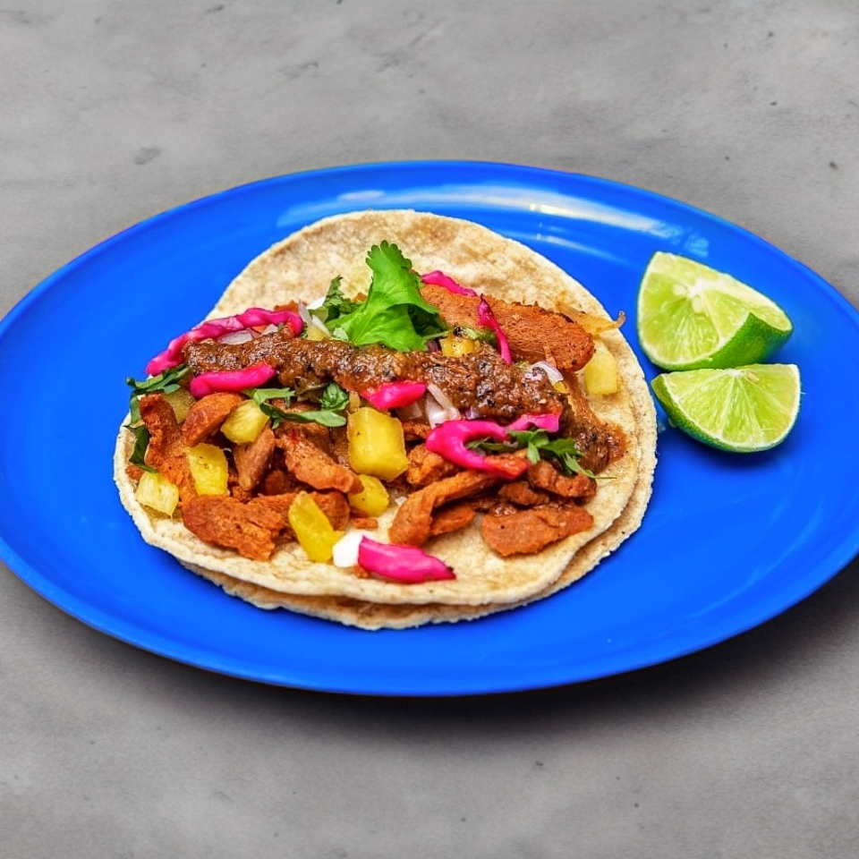 Tortilla de harina grande rellena de pastor, queso, frijoles negros, arroz, y col. Incluye salsa a elecciòn.