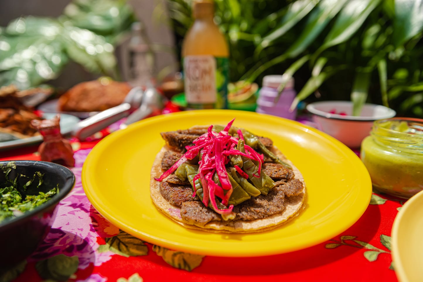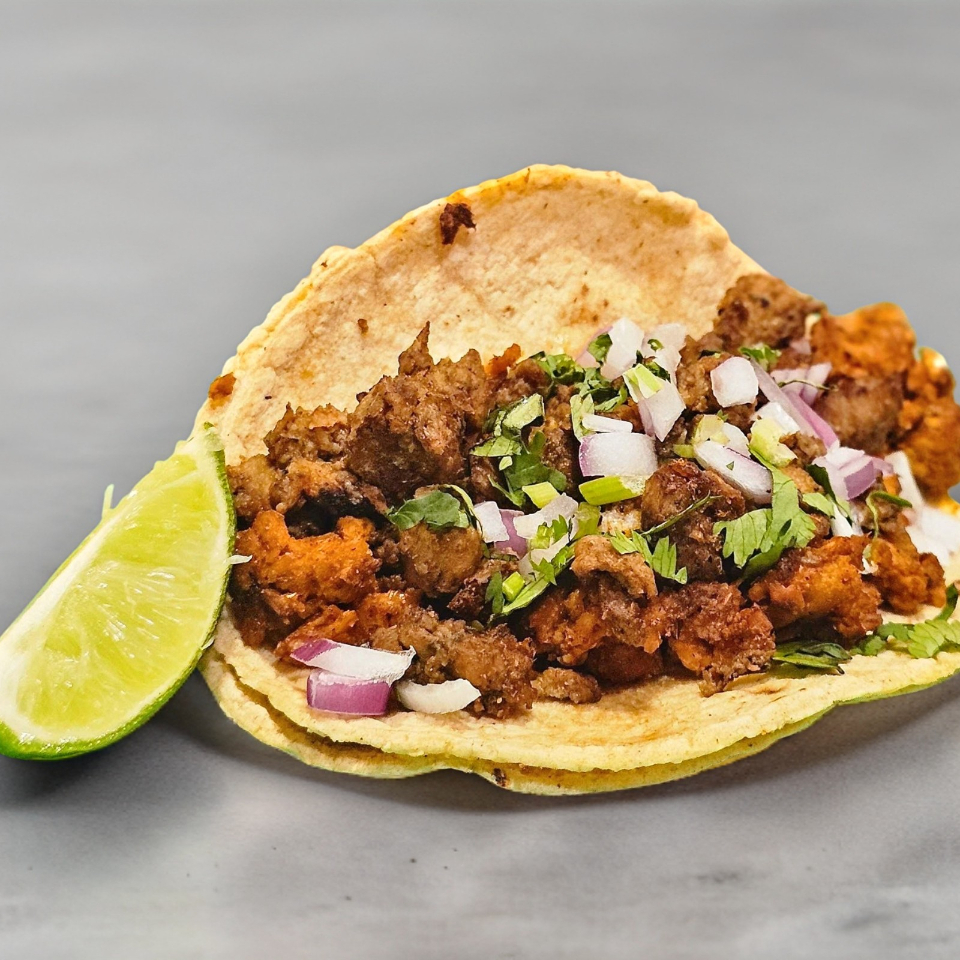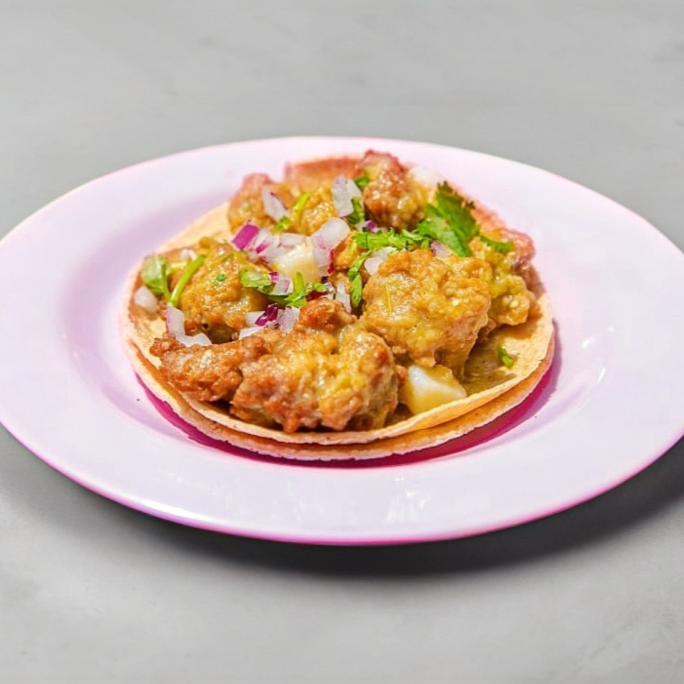 Chicharrón de seitán con papas en salsa verde, servido en doble tortilla