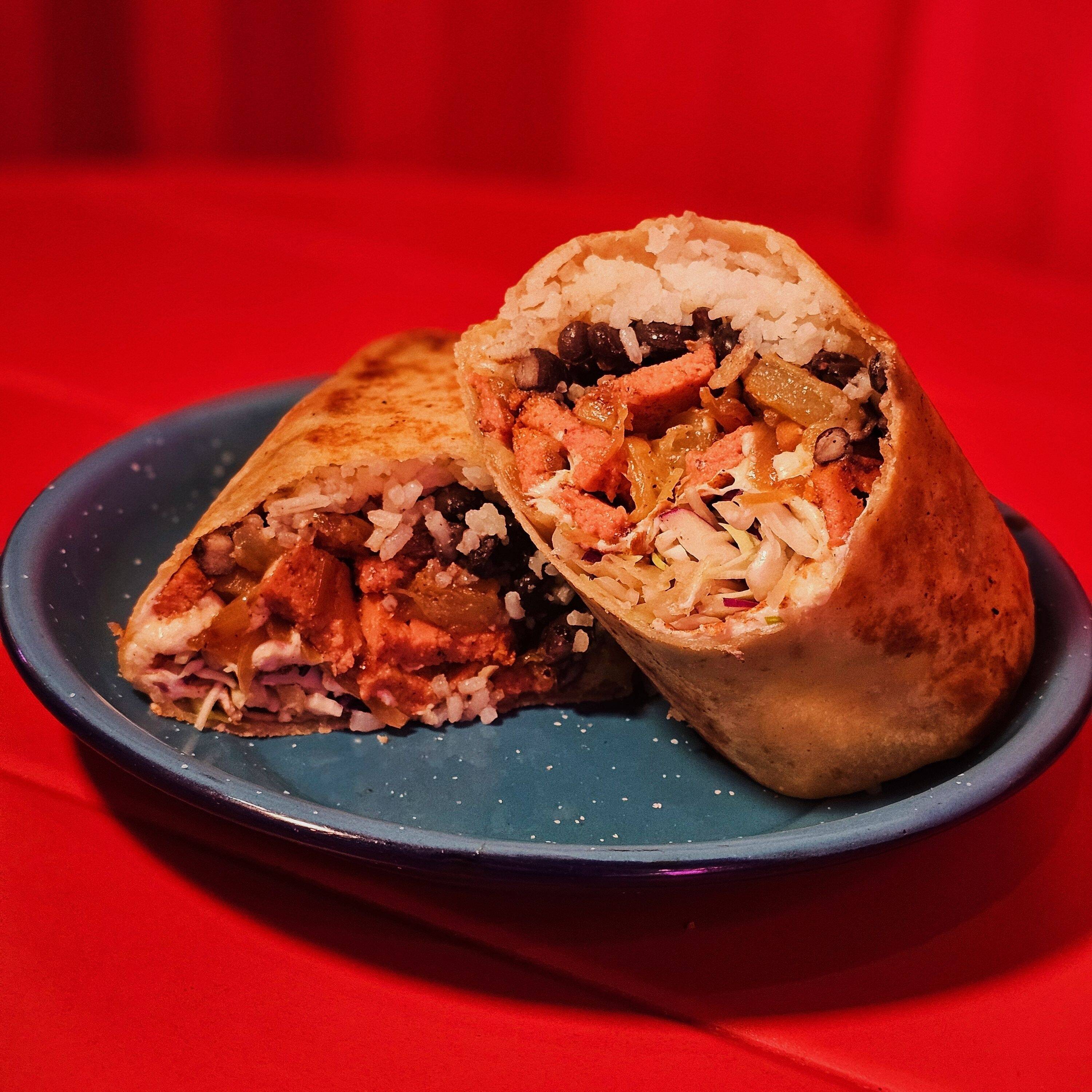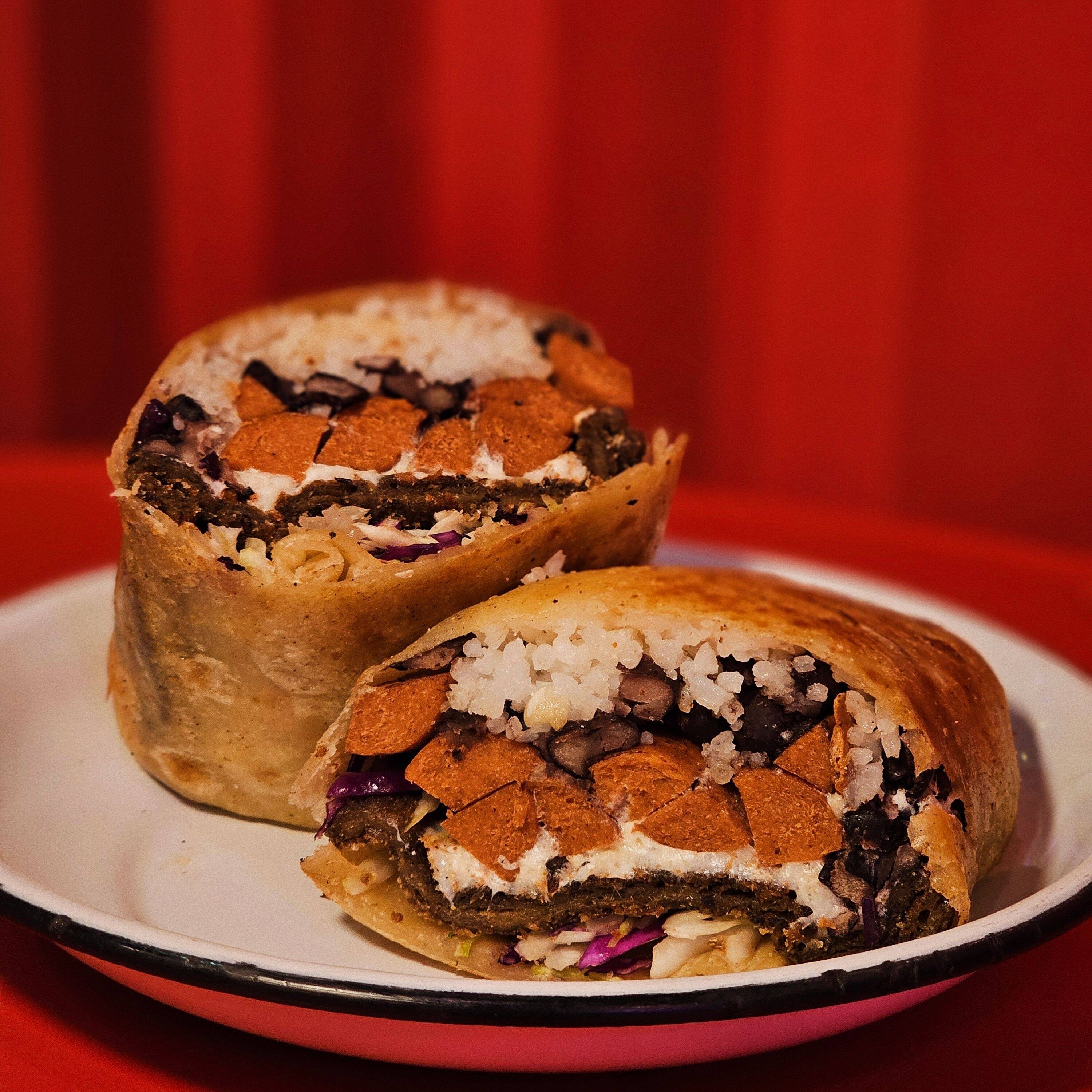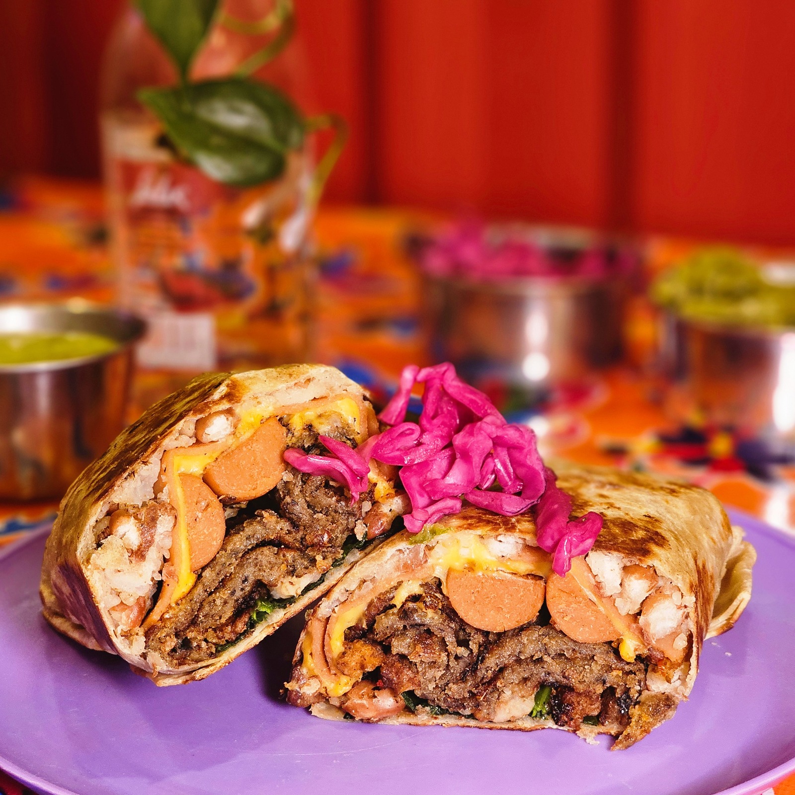 Tortilla de harina grande rellena de milanesa, salchicha, queso, frijoles negros, arroz, y col. Incluye salsa a elecciòn.