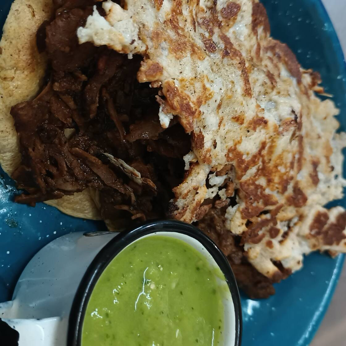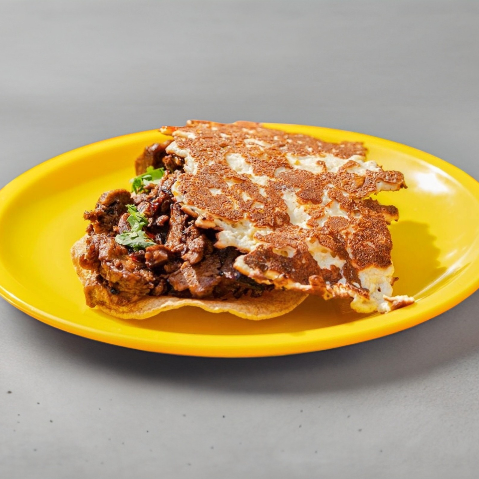 Dos tortillas de maíz tostadas, costra de queso y arrachera con chorizo rojo.