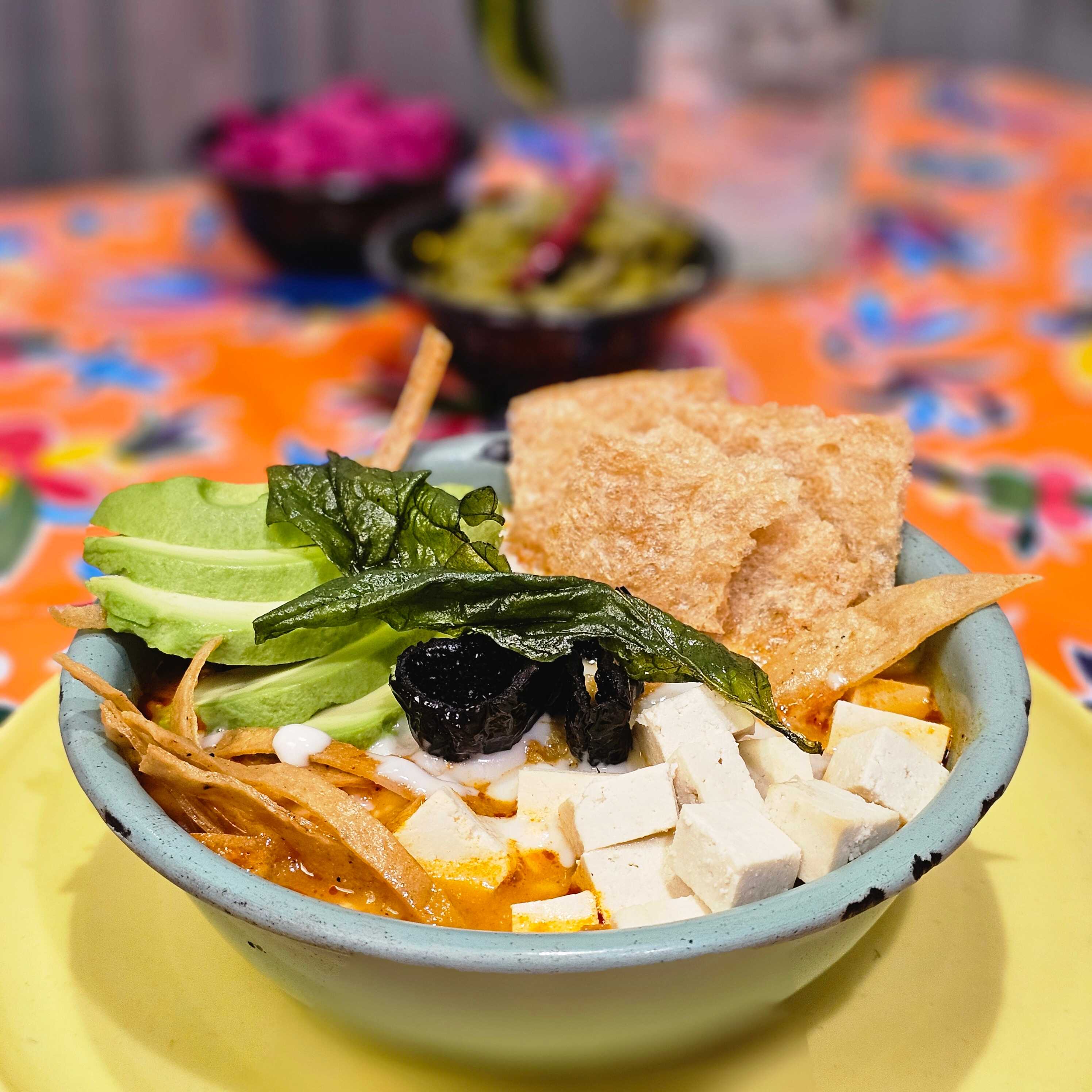 Caldillo de jitomate, tiras de tortilla frita, aguacate, crema, queso, chile ancho y chicharrón crujiente.