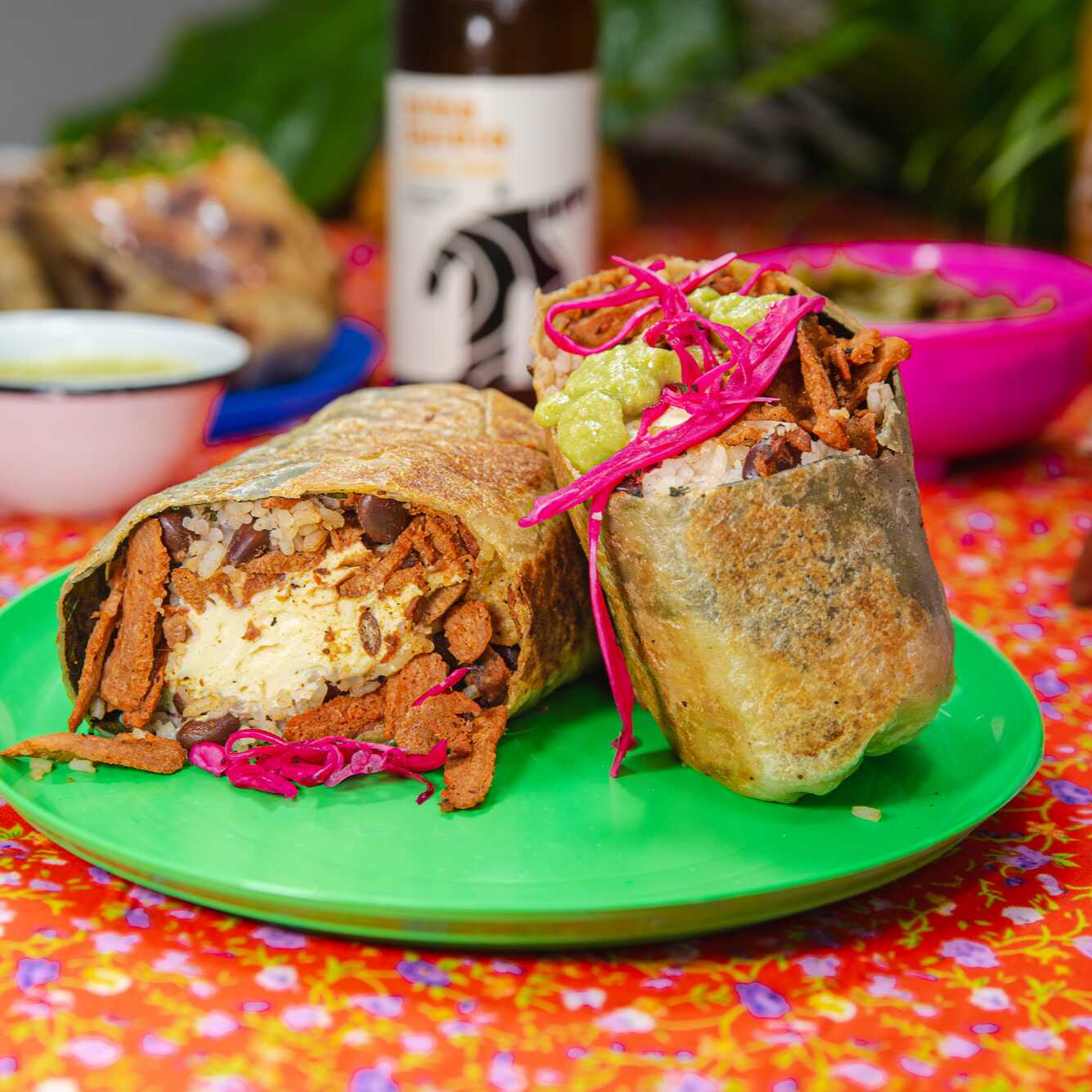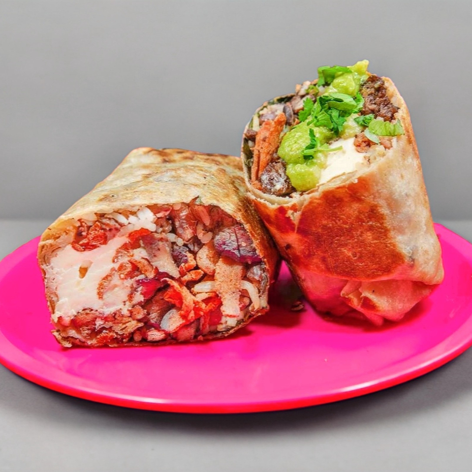 Tortilla de harina grande rellena de pastor, arrachera marinada, queso, frijoles negros, arroz, y col. Incluye salsa a elecciòn.