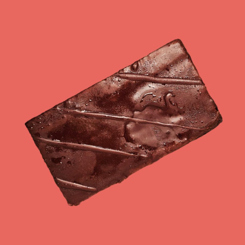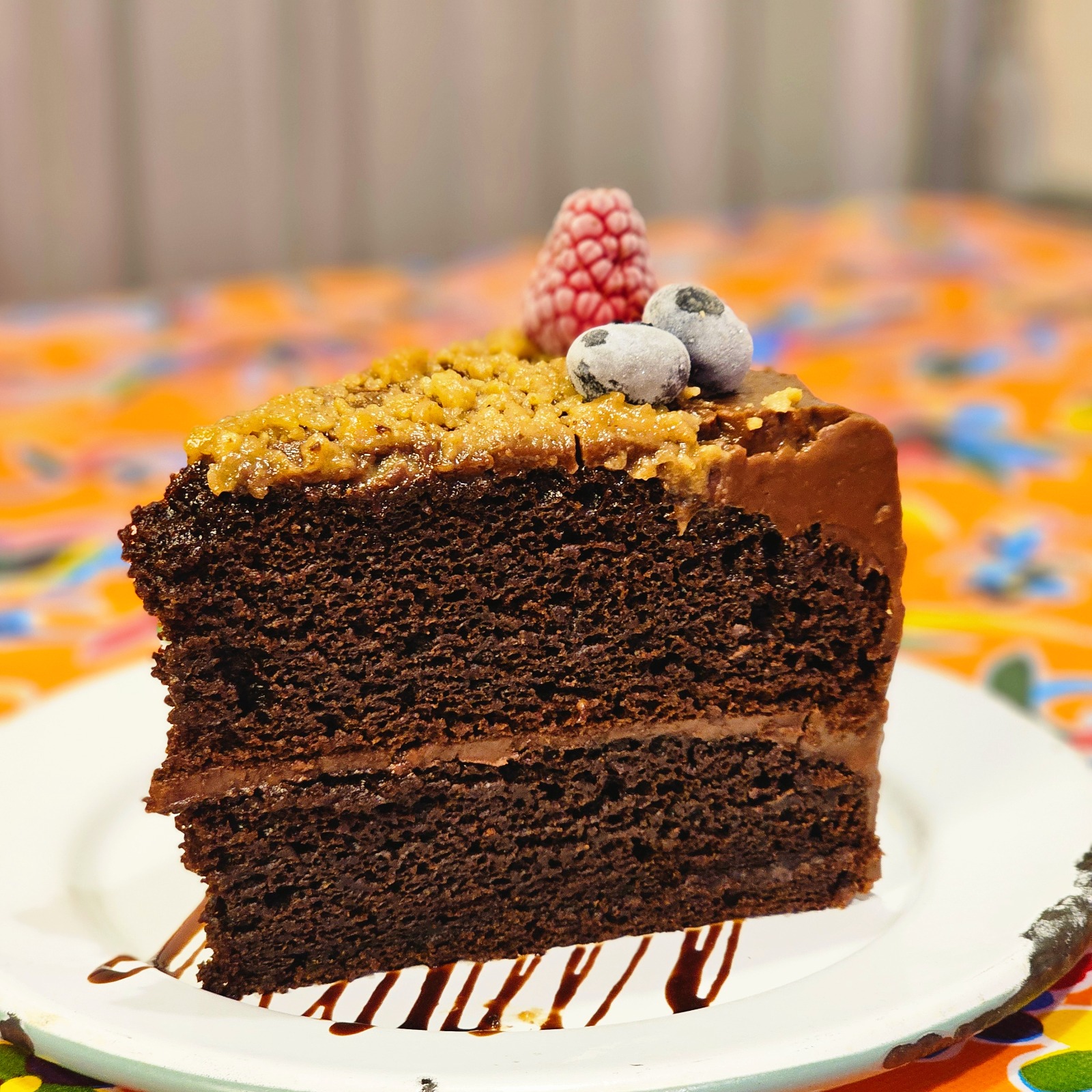 Pastel de chocolate suave y esponjoso con ganache de cocoa y mazapán. Rebanada grande.