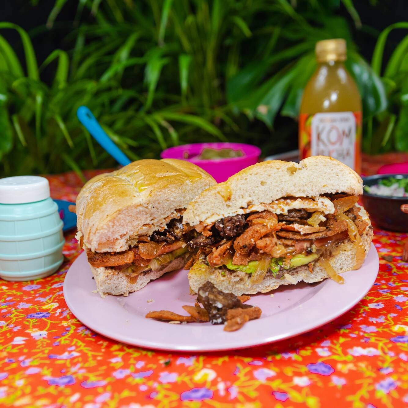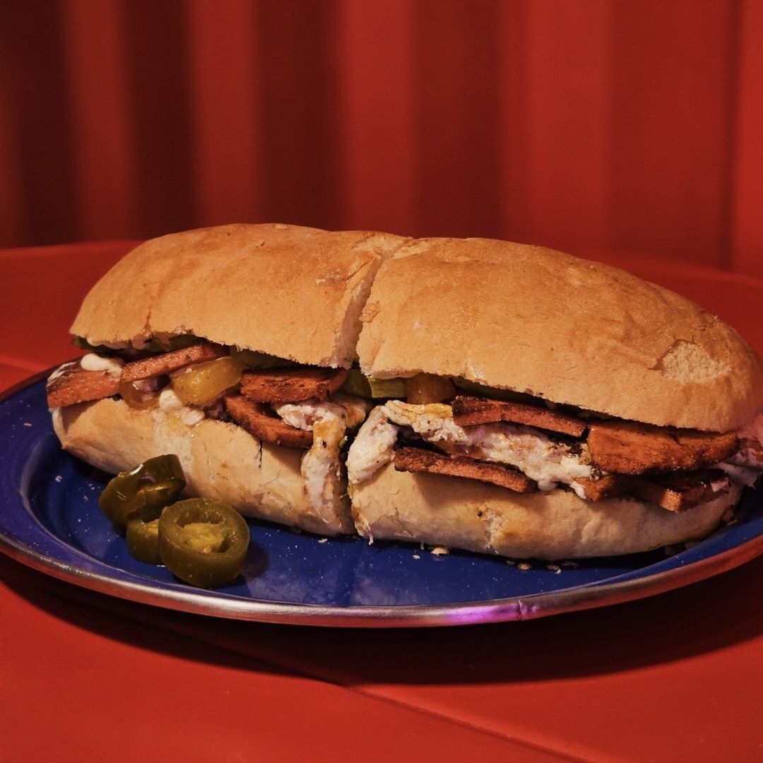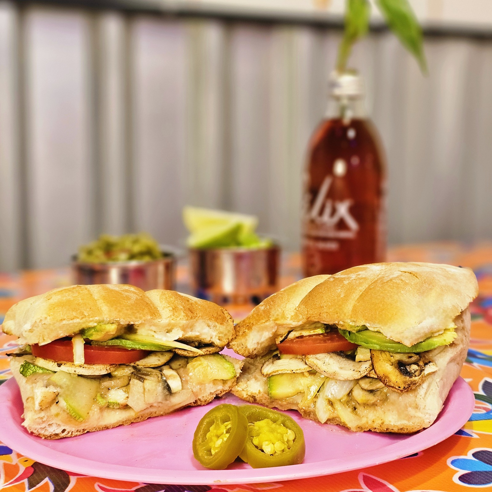 Telera grande con calabaza, champiñon, berenjena, pimientos, chimichurri, queso, mayonesa, frijoles refritos, jitomate, aguacate y cebolla caramelizada. Incluiye chipotle o chiles en vinagre.