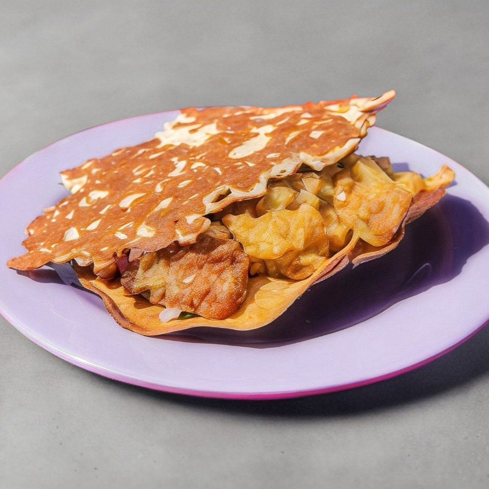 Dos tortillas de maíz tostadas, costra de queso y suadero de soya.