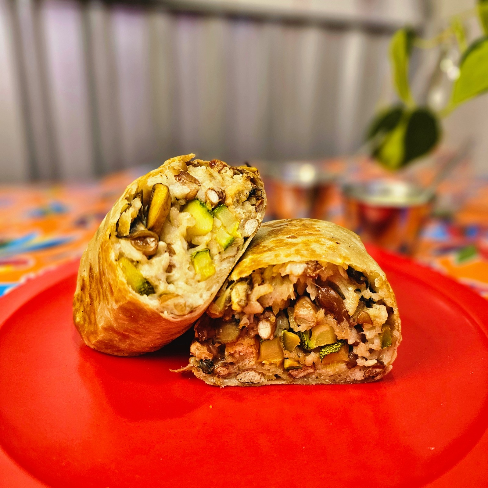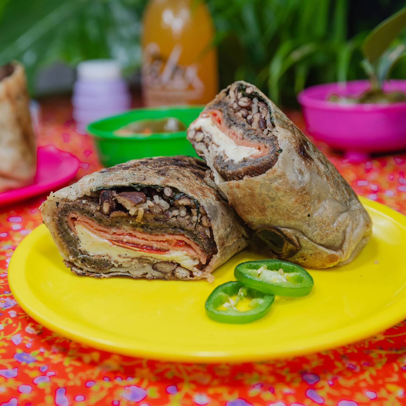 Tortilla de harina grande con calabaza, berenjena, champiñones, pimientos, queso, chimichurri, frijoles negros, arroz y col.