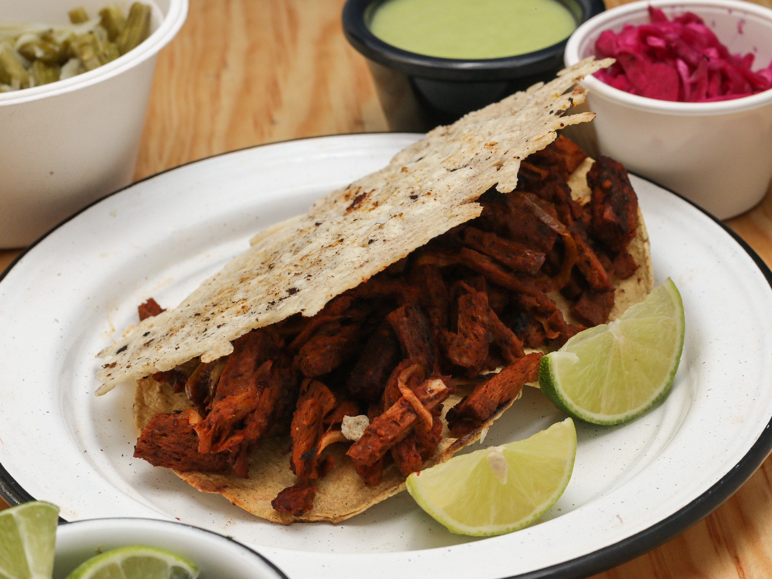 Dos tortillas de maíz tostadas, costra de queso y arrachera de seitán.