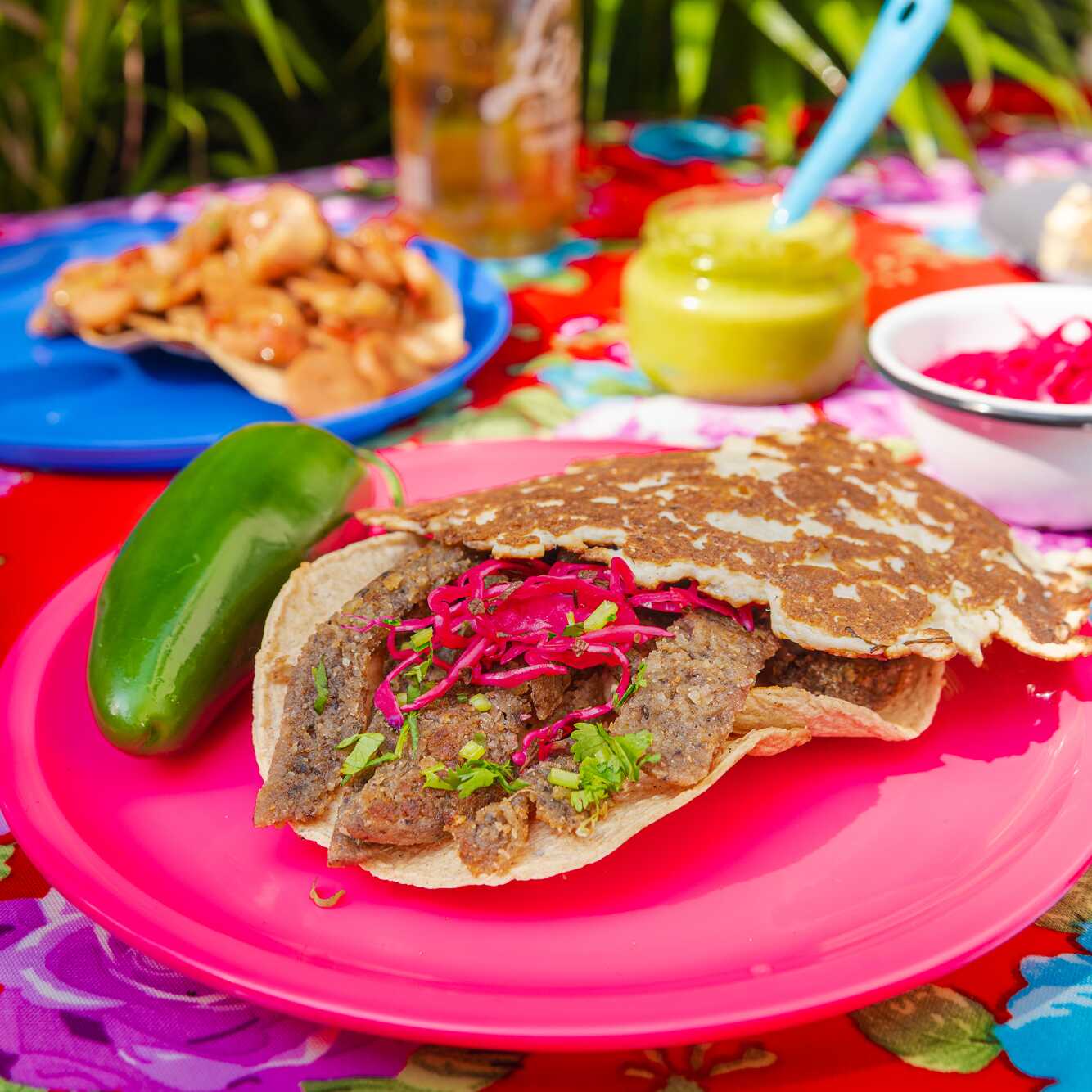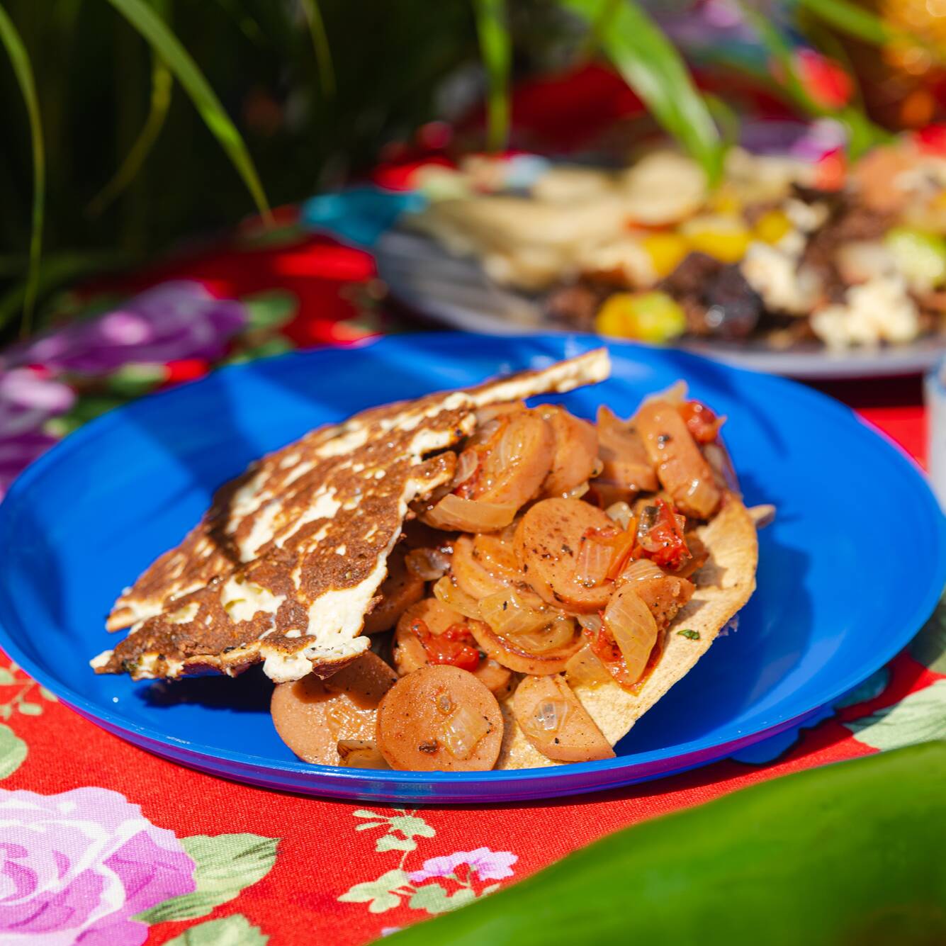 Dos tortillas de maíz tostadas, costra de queso y salchichas de seitán y tofu.