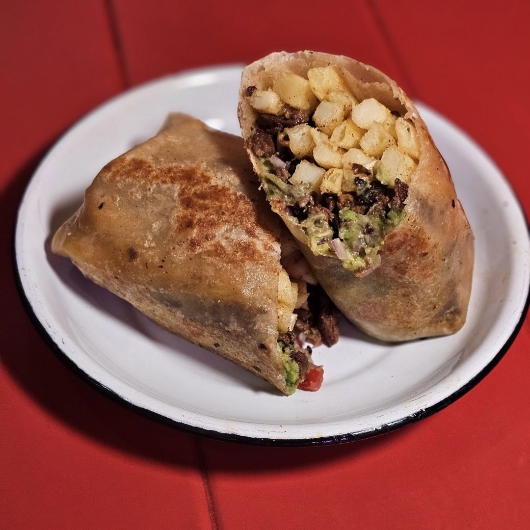 Tortilla de harina grande, rellena de arrachera marinada, papas fritas, guacamole y pico de gallo.