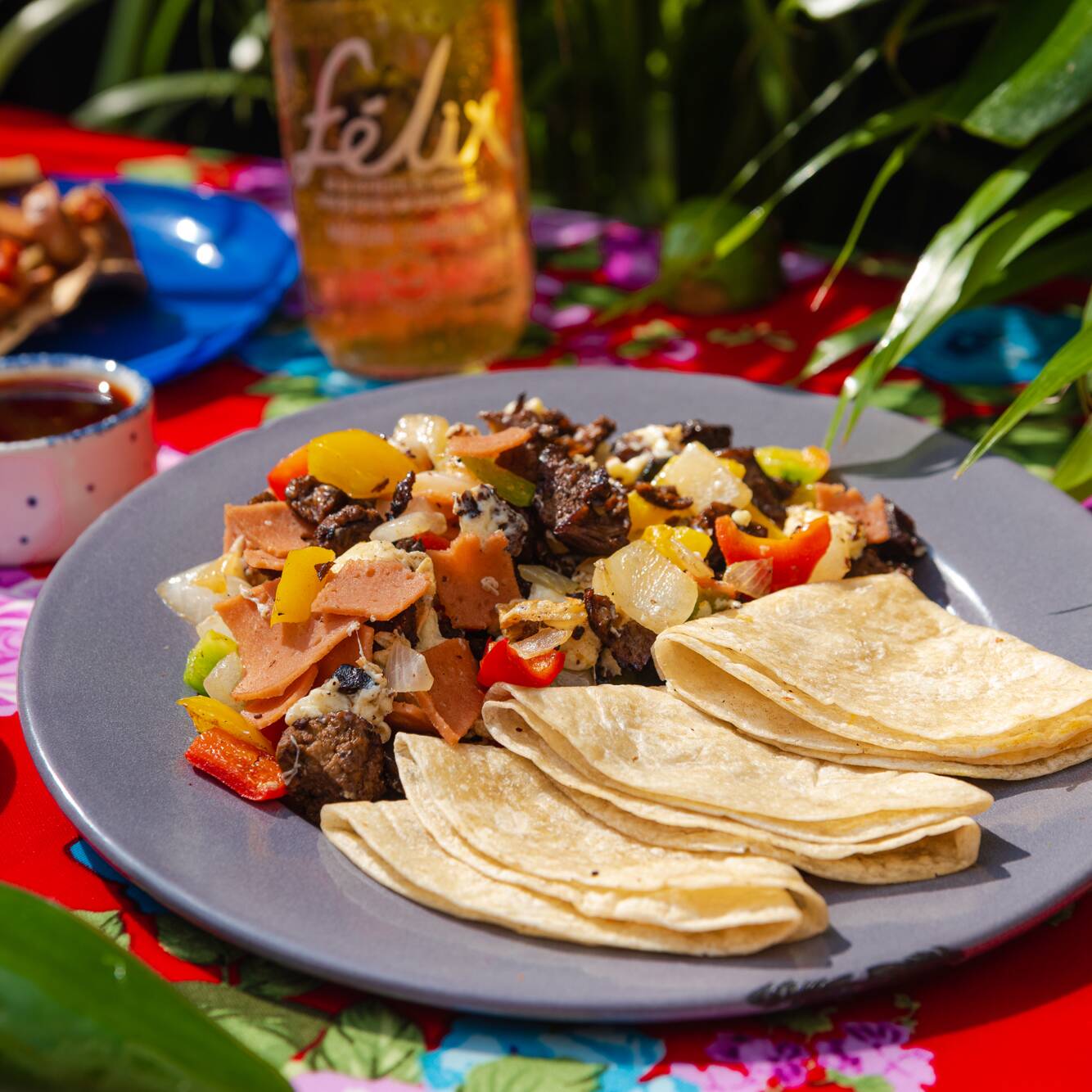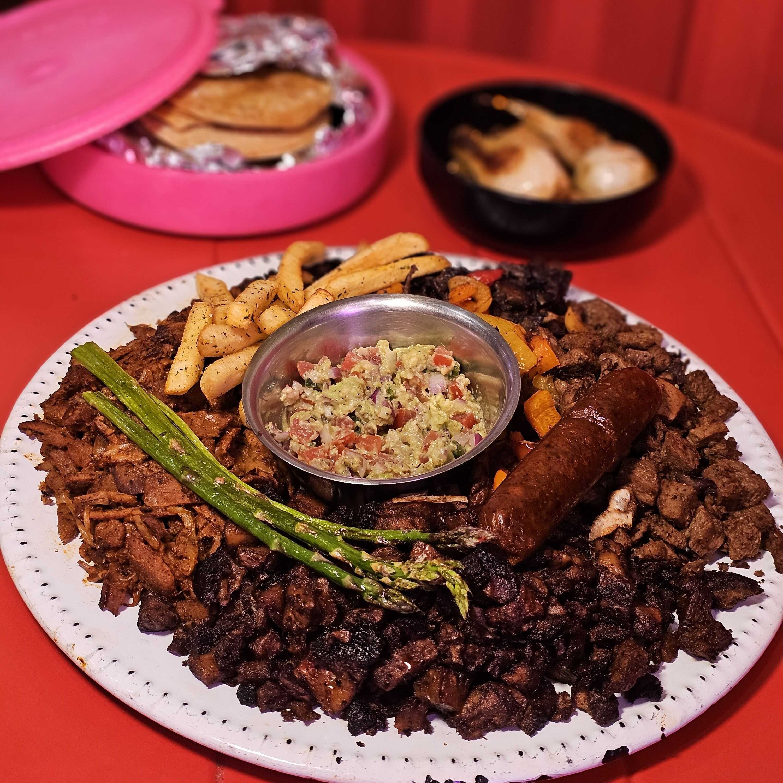 Mix de pimientos, arrachera marinada o suadero, tocino, cebolla morada, hongos, queso mozzarella. Incluye frijoles enteros, salsas, limones y tortillas (harina ó maíz).