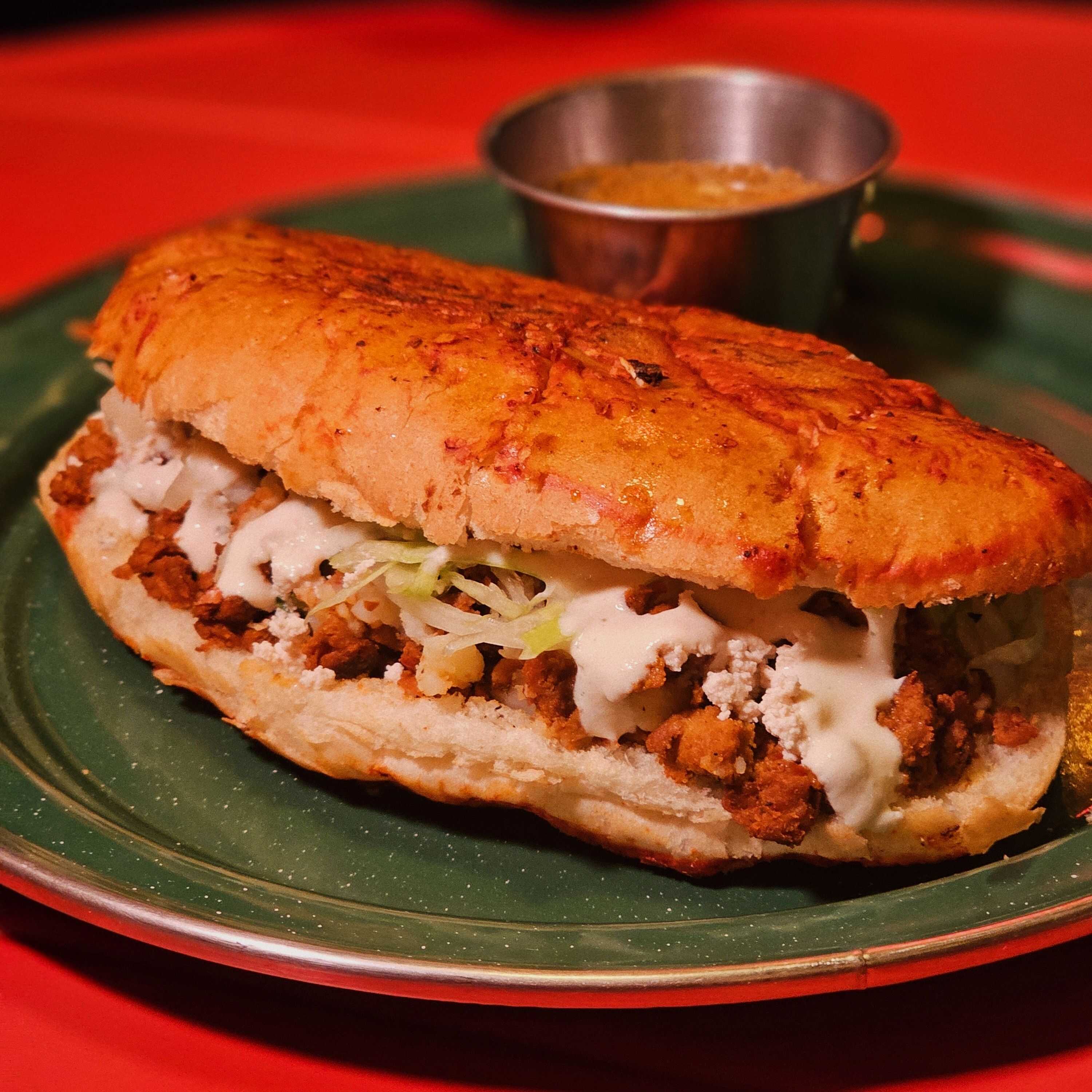 Pan adobado en salsa de chiles, relleno de chorizo rojo con papas, quesofu, crema y lechuga.