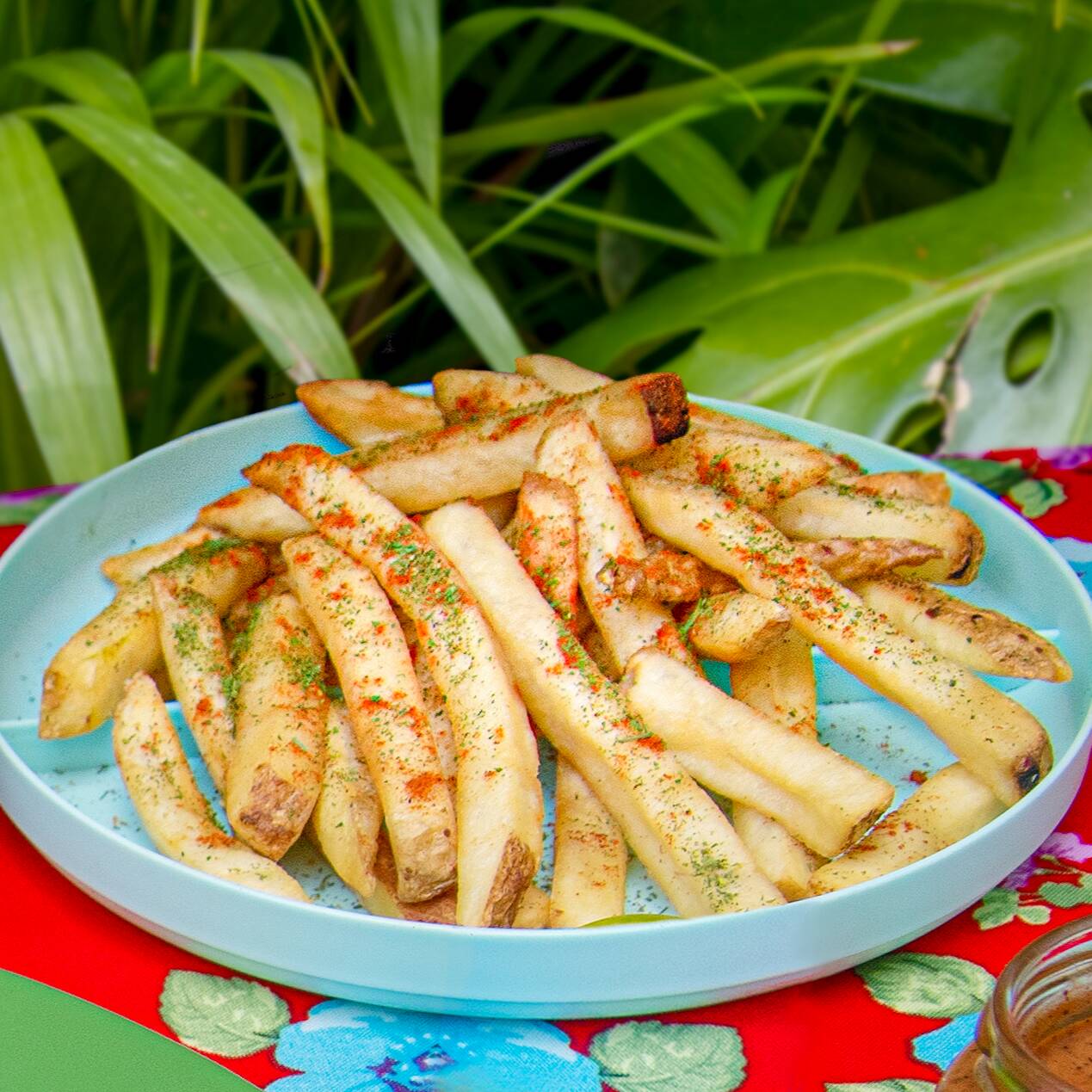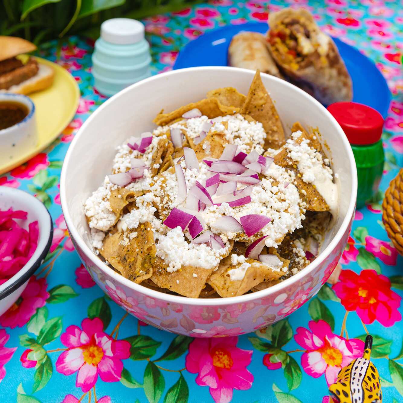 Totopos bañados en salsa verde tatemada o roja maya, queso fresco, crema, aguacate y cebolla morada. Agrega carne vegetal a elección