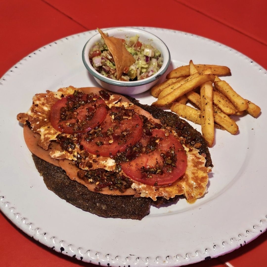 Milanesa cubierta de jamòn, queso, rodajas de jitomate y chimichurri. Acompañada de guacamole, papas fritas y tortillas.
